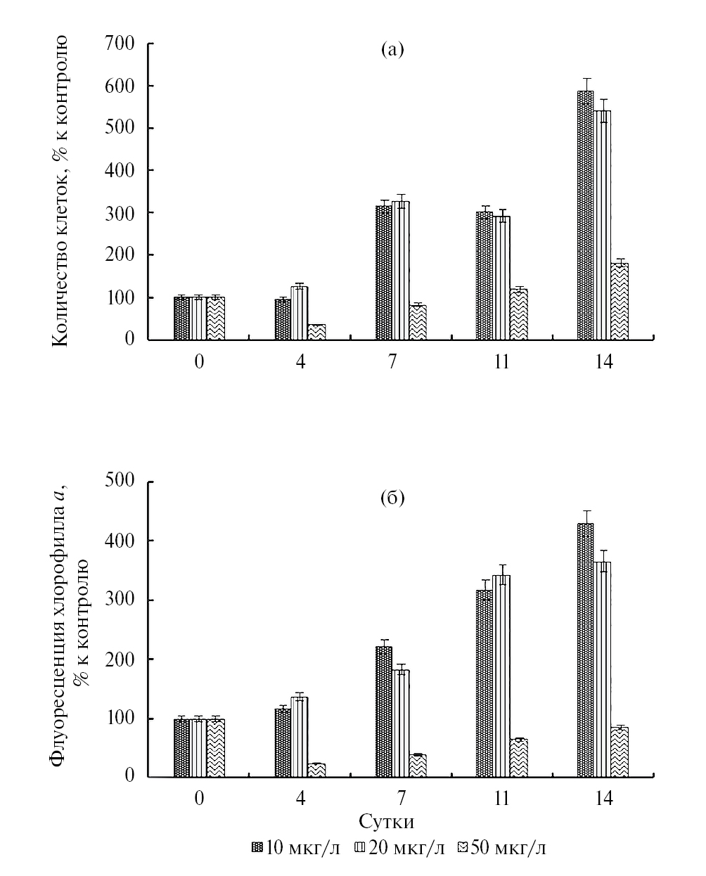В присутствии 10 и 20 мкг/л меди флуоресценция хлорофилла а была существенно выше контрольной на всем протяжении опыта (рис. 1б). Медь в концентрации 50 мкг/л на 4-е сутки вызывала снижение этого показателя; в дальнейшем он увеличивался, но не достигал контрольного значения.