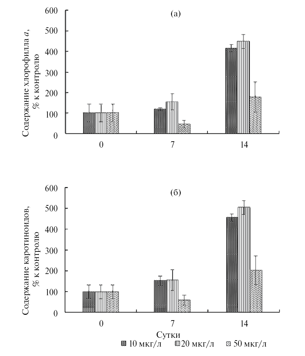 Содержание хлорофилла а и каротиноидов превышало контрольное при добавлении 10 и 20 мкг/л меди, особенно на 14-е сутки опыта (рис. 2). Наличие в среде 50 мкг/л вещества приводило к снижению содержания пигментов на 7-е сутки, а на 14-е превышало контрольное в два раза.