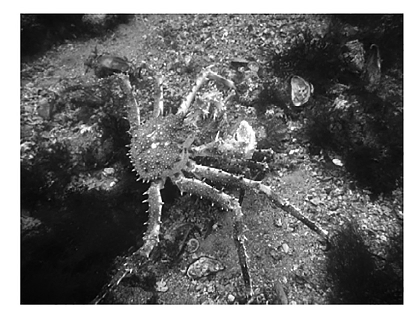 Рис. 1. Самец Lithodes maja удерживает самку перед собой. Баренцево море, губа Амбарная.