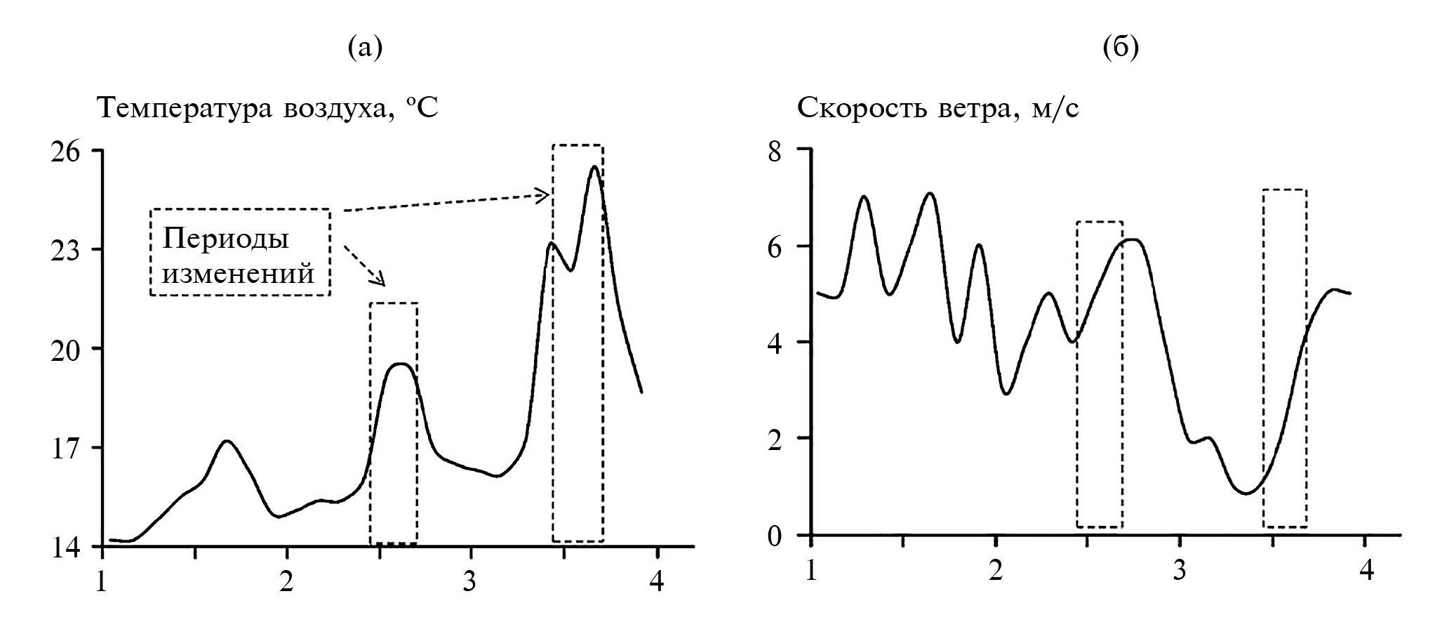 Рис. 2. Температура воздуха (а) и модуль скорости ветра (б) с 1 по 3 июля 2022 г. (по: Архив погоды …, 2024).