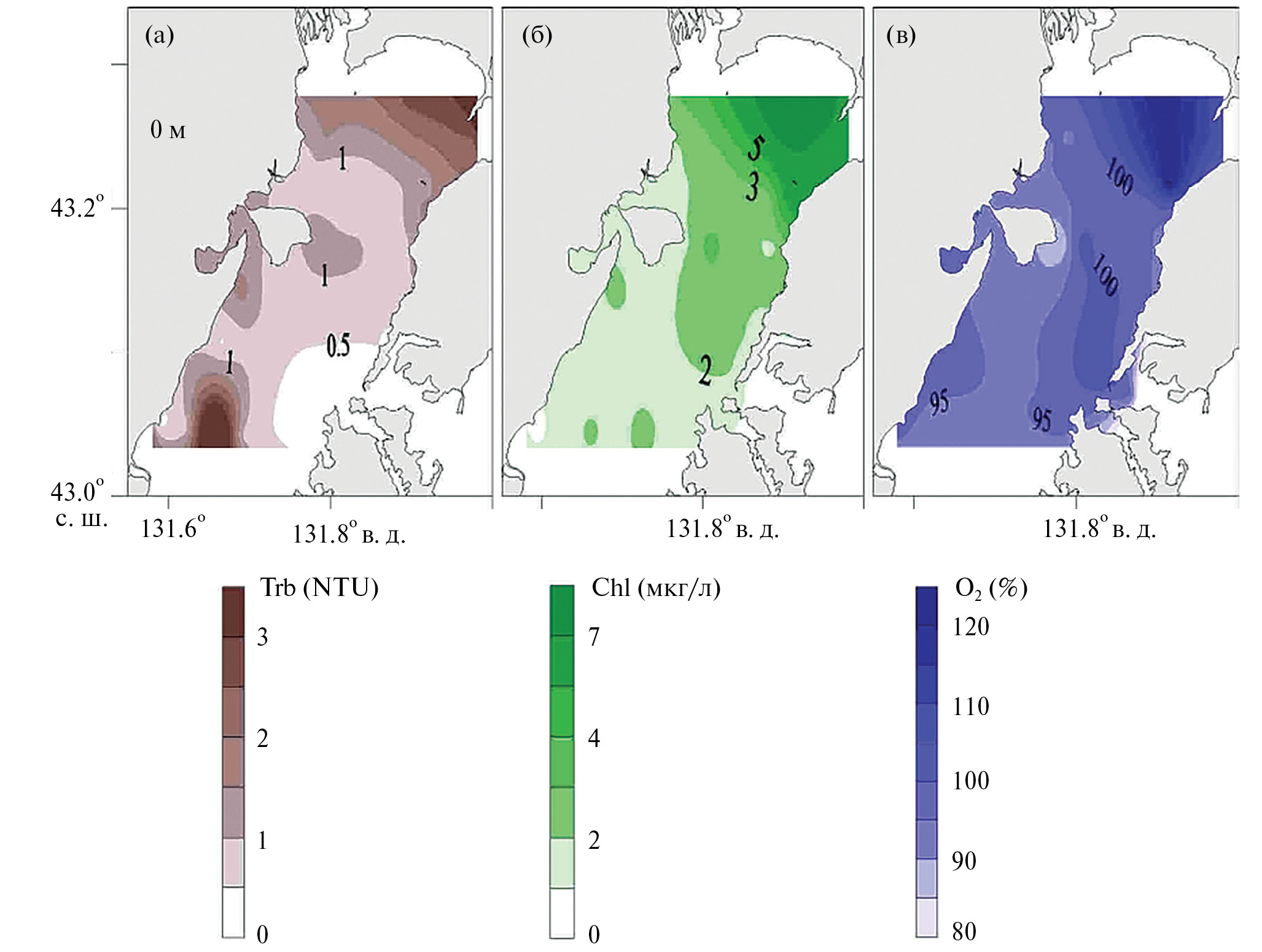 Согласно данным, полученным с помощью профилографа на станциях отбора проб воды (табл. 2), температура воды в поверхностном слое изменялась от 17.9°С до 23°С, наименьшее значение выявлено вблизи мыса Перевозный, наибольшее – на мелководье между мысом Де-Фриза и ж/д ст. Океанская. Пространственное распределение солености имело противоположный характер, варьируя от 16 до 30.7 епс. При этом пул станций с наименьшей величиной солености и максимальной мутностью воды (до 3.4 NTU) концентрировался в северо-восточном секторе залива, вода на южных станциях была более соленой и прозрачной (менее 1 NTU). Концентрации хлорофилла a и растворенного кислорода повторяли абрис мутности, варьируя от 0.8 до 9.7 мкг/л и от 6.7 до 9.6 мг/л соответственно. При этом максимум насыщения вод кислородом достигал 123% на самой северной станции 17.