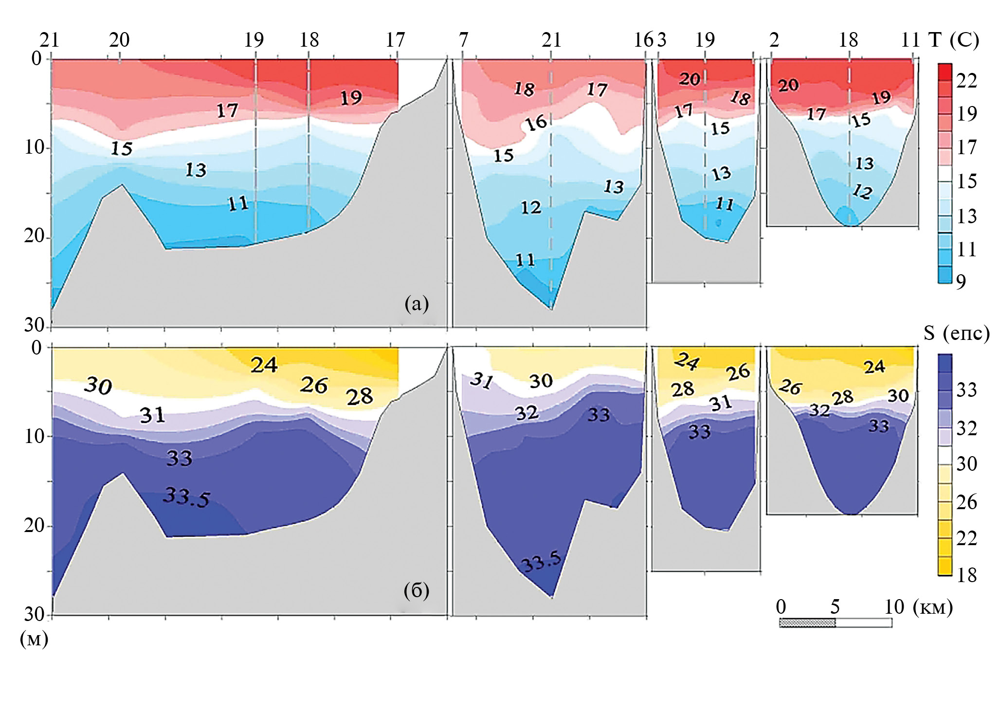 Рис. 4. Распределение температуры (а) и солености (б) в толще вод залива на осевом и поперечных разрезах 2–3 июля 2022 г. Станции, расположенные на пересечении разрезов, отмечены вертикальными пунктирами.