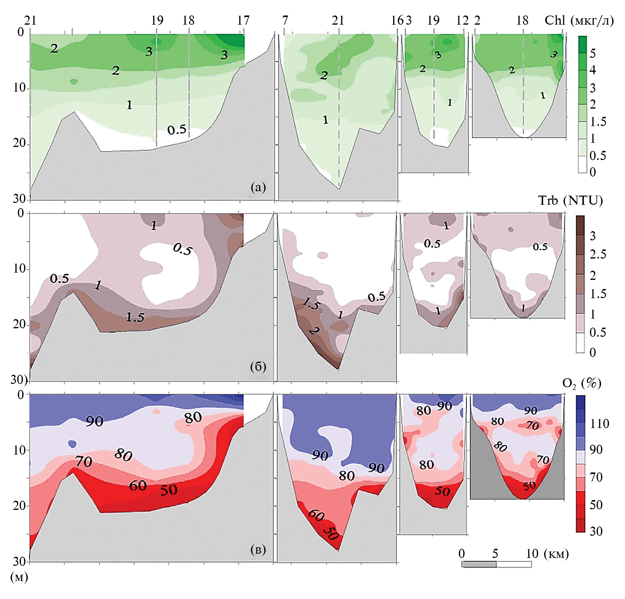 Анализ распределения хлорофилла a и насыщения вод кислородом выявил их высокие уровни (соответственно > 2 мкг/л и > 80%) в пределах верхнего 5-метрового слоя (рис. 5а, 5в), что свидетельствует об активизации цветения фитопланктона. Падение содержания кислорода до 50% и менее в придонном слое севернее и южнее Муравьевского порога указывает на начало тотального развития сезонной гипоксии. Ее ежегодное присутствие в водах Амурского залива обусловлено эффектом эвтрофикации (Звалинский и др., 2012), который к моменту проведения съемки из-за муссонного нагона уже проявился на северо-восточном мелководье (о-в Скребцова – устье р. Седанка). Здесь из-за цветения микроводорослей в поверхностном слое содержание хлорофилла a достигало 6–9 мкг/л, процент насыщения вод кислородом превышал 100%, а в придонном слое кислород практически отсутствовал (<5%). В промежуточной толще вод на осевом и поперечных разрезах наблюдались лучшие экологические условия (70–80% кислорода).