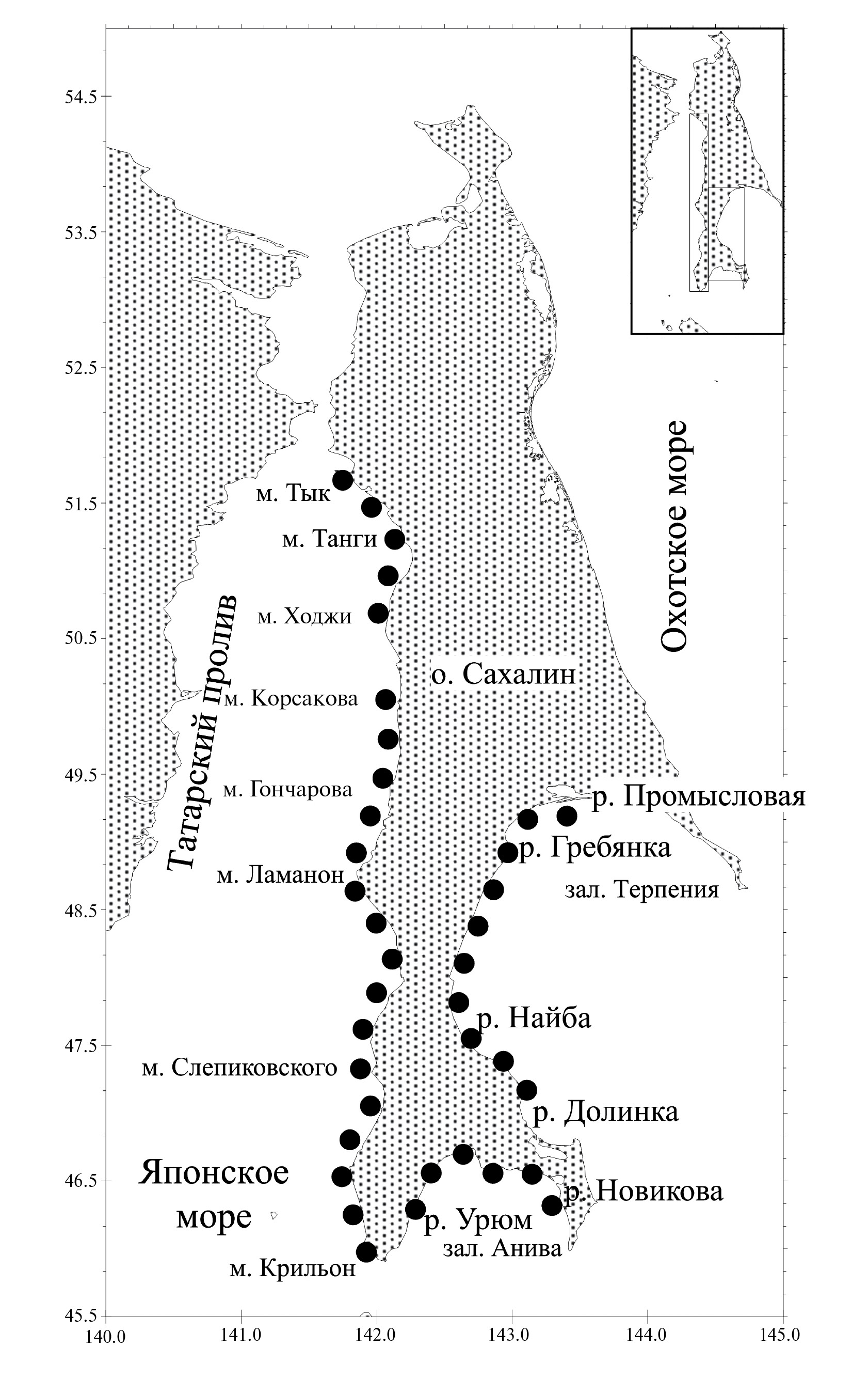 Основой для анализа распределения и биологии Arctoscopus japonicus послужили сборы, проведенные сотрудниками СахНИРО в ходе учетных съемок в мае–октябре 1998–2022 гг. у западного (от мыса Тык до мыса Крильон), юго-восточного (от р. Промысловая до р. Долинка) побережий о-ва Сахалин и в зал. Анива (от р. Урюм до р. Новикова) (рис. 1). Всего обработаны данные 11-ти съемок. Орудиями лова служили закидные неводы разного размера: длина 30, 50, 90, 100 и 240 м, высота стенки 3–4 м, размер ячеи 10 и 12 мм. Площадь облова на разных станциях в зависимости от параметров закидного невода, рельефа и уклона дна изменялась от 300 до 12000 м2. Дополнительно использовали ставные сети длиной от 5 до 100 м и высотой стенки от 5 до 10 м, размер ячеи в сетях варьировал от 15 до 30 мм. Глубина облова закидными неводами от уреза воды достигала 2.5–4.0 м, глубина постановки ставных сетей изменялась от 2 до 5 м.