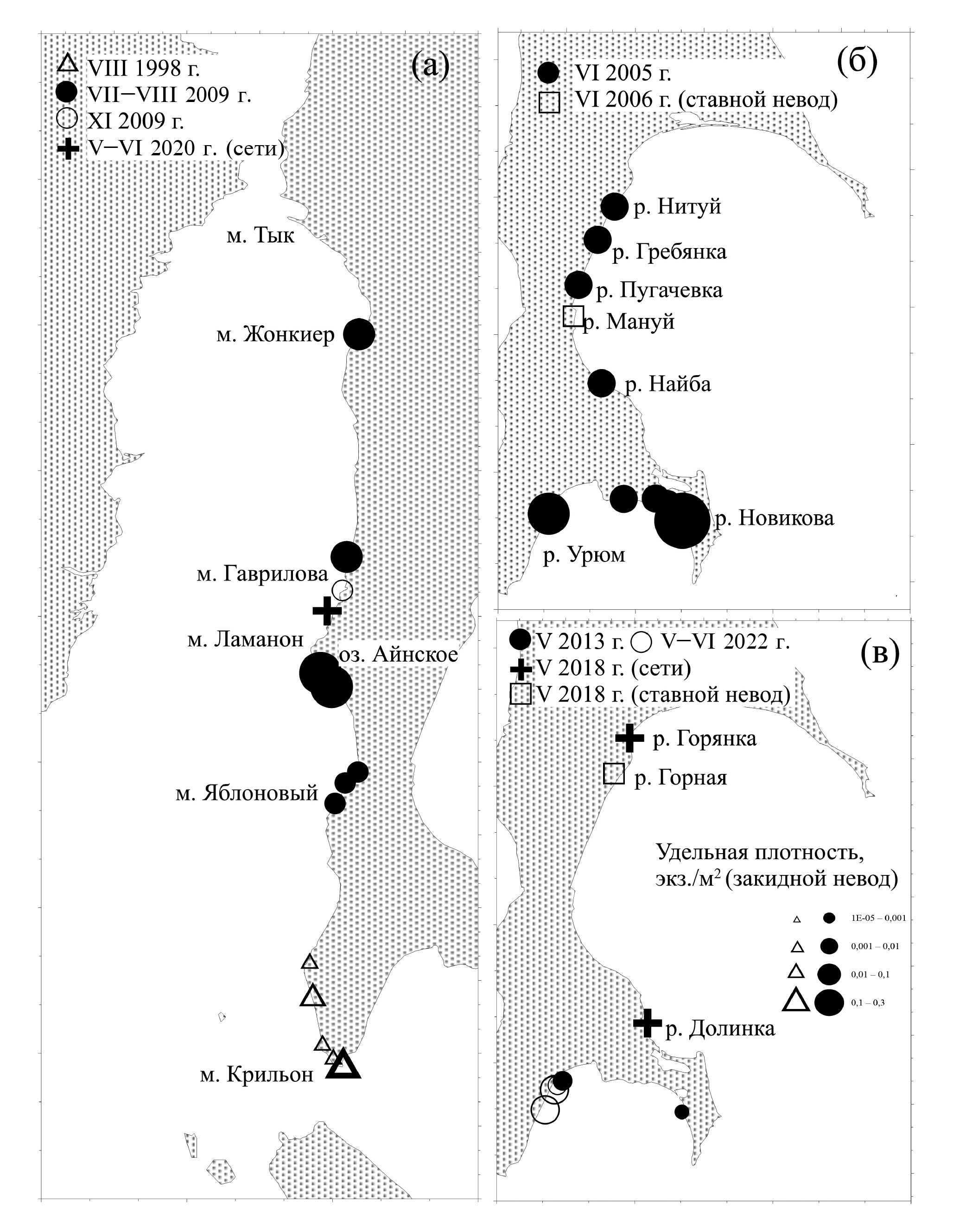 Рис. 2. Места поимок японского волосозуба Arctoscopus japonicus у западного (а) и юго-восточного побережья (б, в) о-ва Сахалин в разные годы.