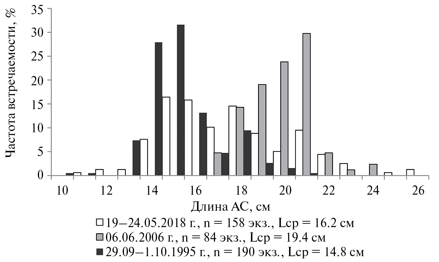 В сентябре в зал. Терпения численность японского волосозуба определялась подходом нерестовых особей. В ставных неводах отмечали половозрелых рыб длиной от 10 до 26 см, среди которых 86.8% были представлены особями длиной 14–18 см (рис. 3). В октябре в Татарском проливе на песчаных грунтах вблизи мыса Гаврилова обнаружена лишь одна особь, в пересчете на единицу площади плотность составила 0.0004 экз./м2, биомасса – 0.012 г/м2.