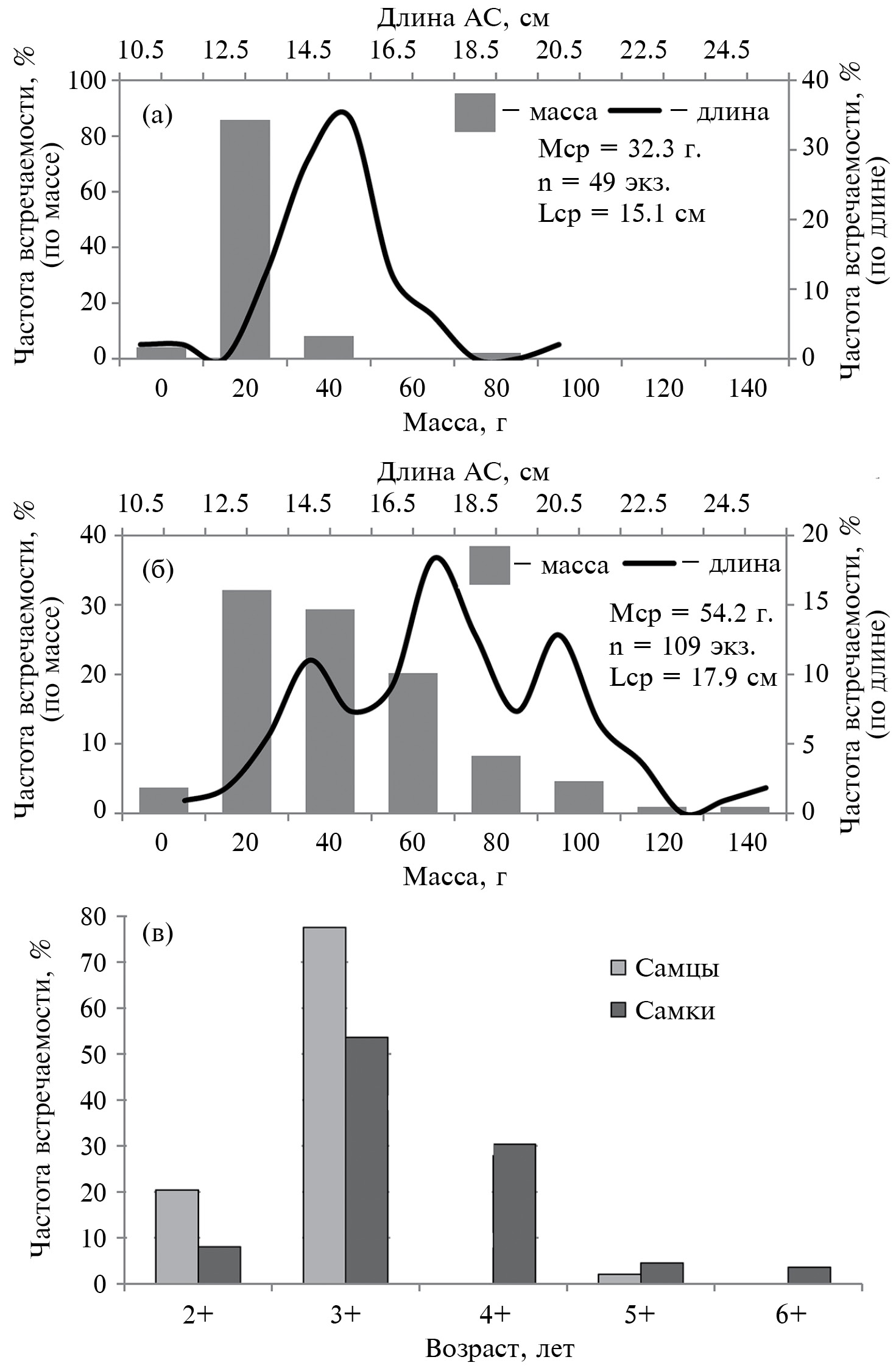 Рис. 4. Размерный состав уловов самцов (а), самок (б) и возрастной состав уловов (в) японского волосозуба Arctoscopus japonicus обоих полов у юго-восточного побережья о-ва Сахалин в мае 2018 г.