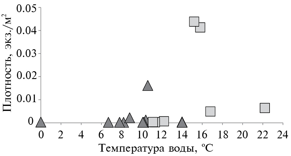 Рис. 5. Плотность скоплений японского волосозуба Arctoscopus japonicus в зависимости от температуры воды. Условные обозначения: треугольник – зал. Анива и юго-восточное побережье о-ва Сахалин (май 2013 и июнь 2005 гг.); квадрат – зал. Терпения (июль–август 2009 г.).