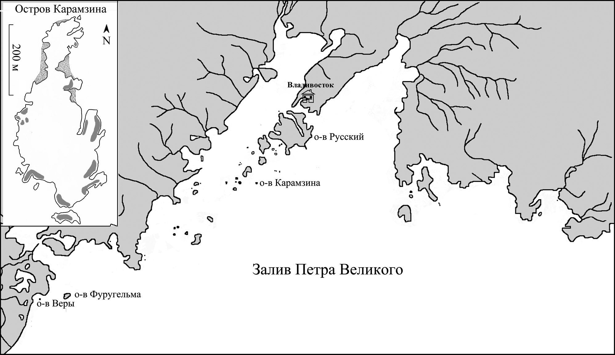 Рис. 1. Карта-схема зал. Петра Великого, на врезке – о-в Карамзина, серым цветом обозначены поселения тонкоклювой кайры.