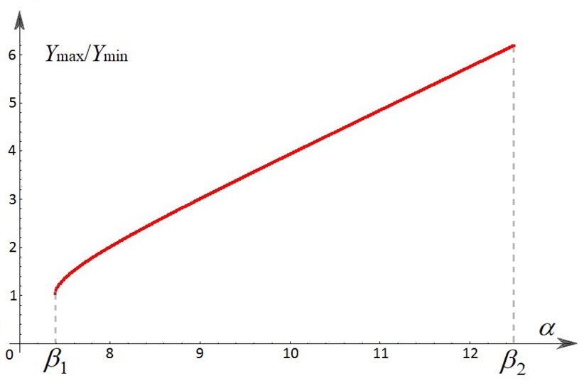 Рис. 1. График зависимости Ymax/Ymin от α при β1 < α < β2.