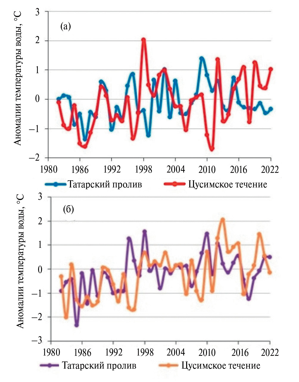 Рис. 4. Аномалии температуры воды в Татарском проливе и в области Цусимского течения в мае (а) и июне (б) с 1982 по 2022 г.