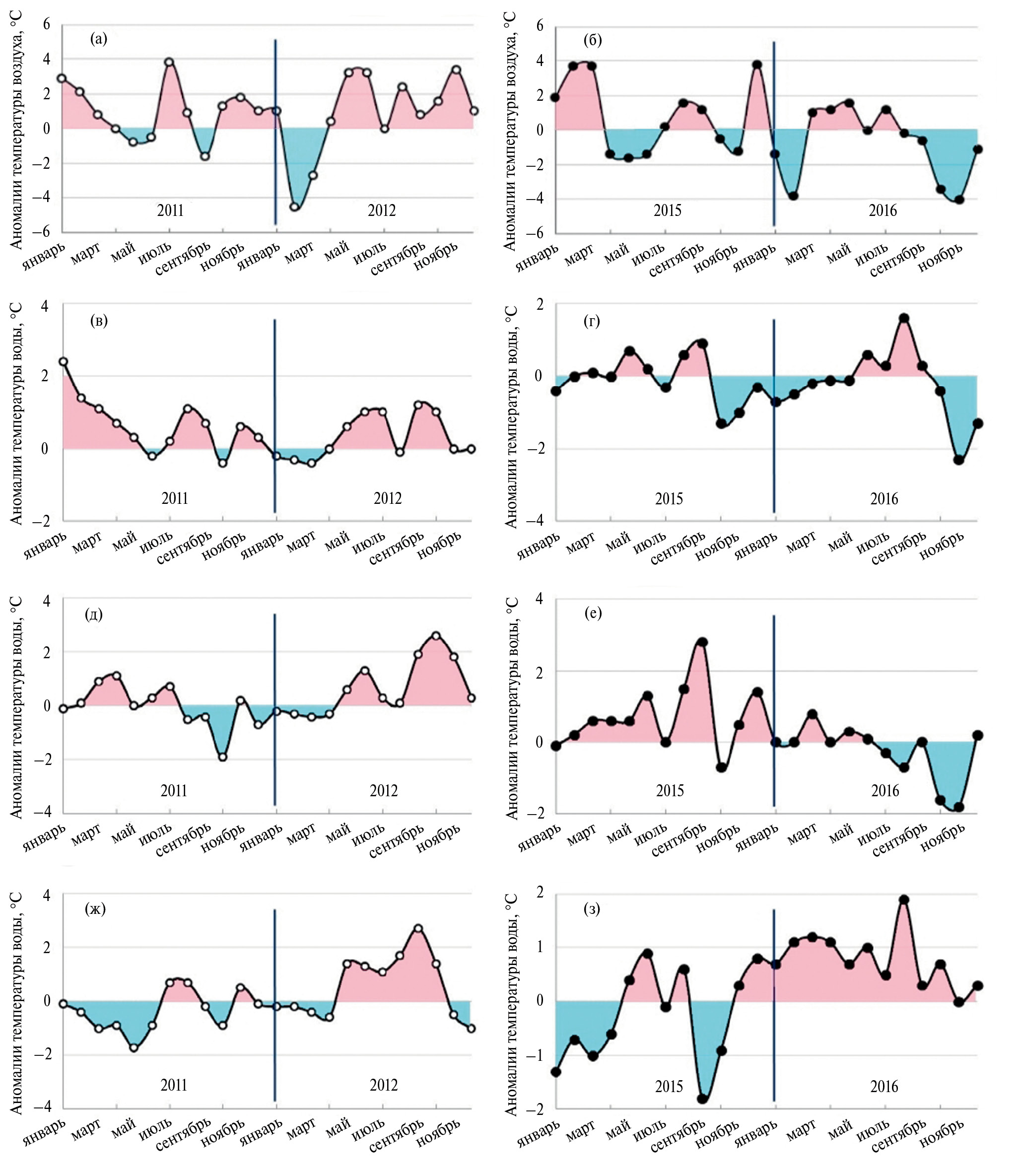Рис. 5. Годовой ход аномалий температуры воздуха на ГМС Николаевск-на-Амуре в 2011 и 2012 гг. (а), в 2015 и 2016 гг. (б); аномалий температуры воды в Татарском проливе в 2011 и 2012 гг. (в), в 2015 и 2016 гг. (г); аномалий температуры воды на ГМС Рудная пристань в 2011 и 2012 гг. (д), в 2015 и 2016 гг. (е) и в области Цусимского течения в 2011 и 2012 гг. (ж) и в 2015 и 2016 гг. (з).