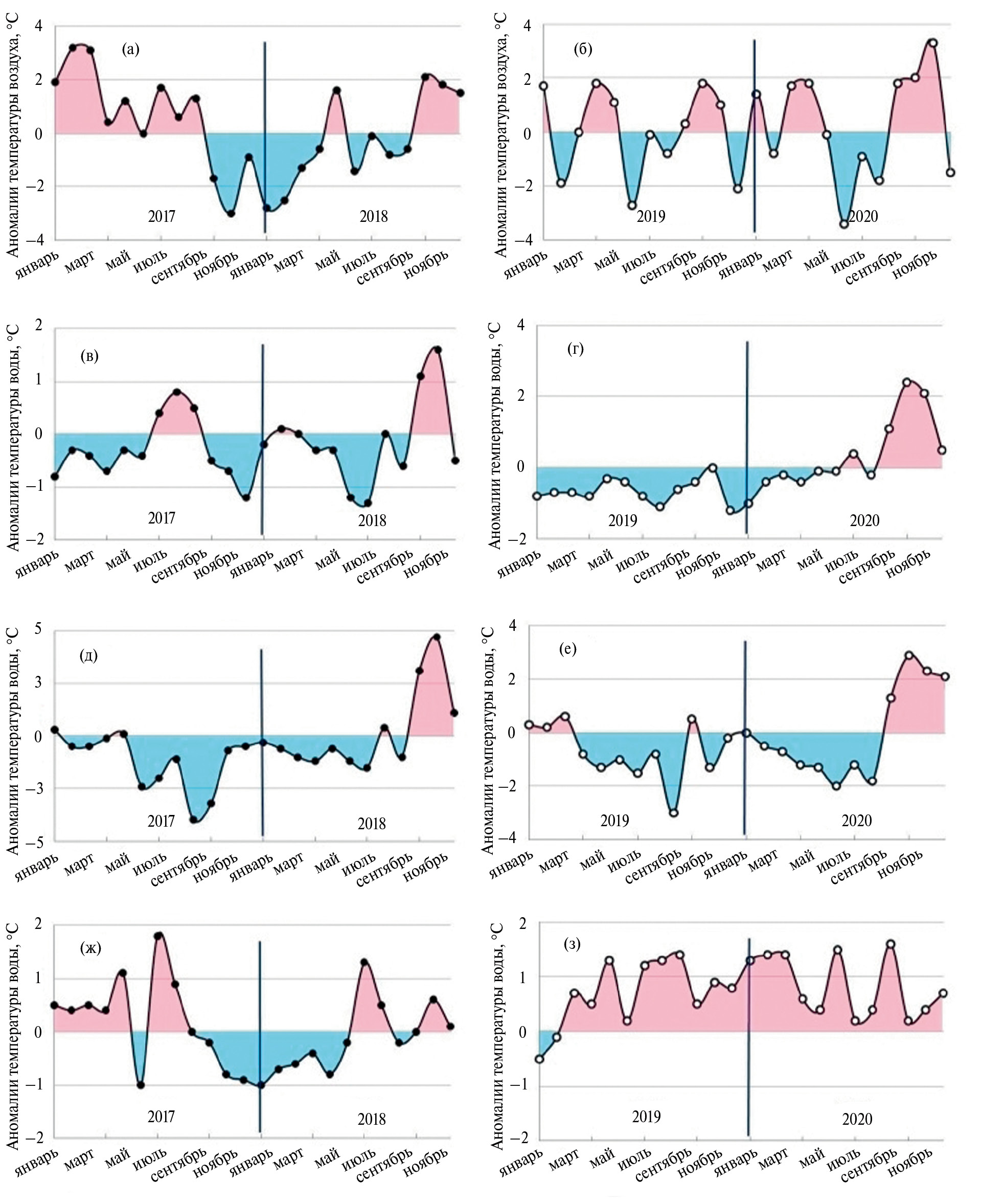 Рис. 6. Годовой ход аномалий температуры воздуха на ГМС Николаевск-на-Амуре в 2017 и 2018 гг. (а), в 2019 и 2020 гг. (б); аномалий температуры воды в Татарском проливе в 2017 и 2018 гг. (в), в 2019 и 2020 гг. (г); аномалий температуры воды на ГМС Рудная пристань в 2017 и 2018 гг. (д), в 2019 и 2020 гг. (е) и в области Цусимского течения в 2017 и 2018 гг. (ж) и в 2019 и 2020 гг. (з).