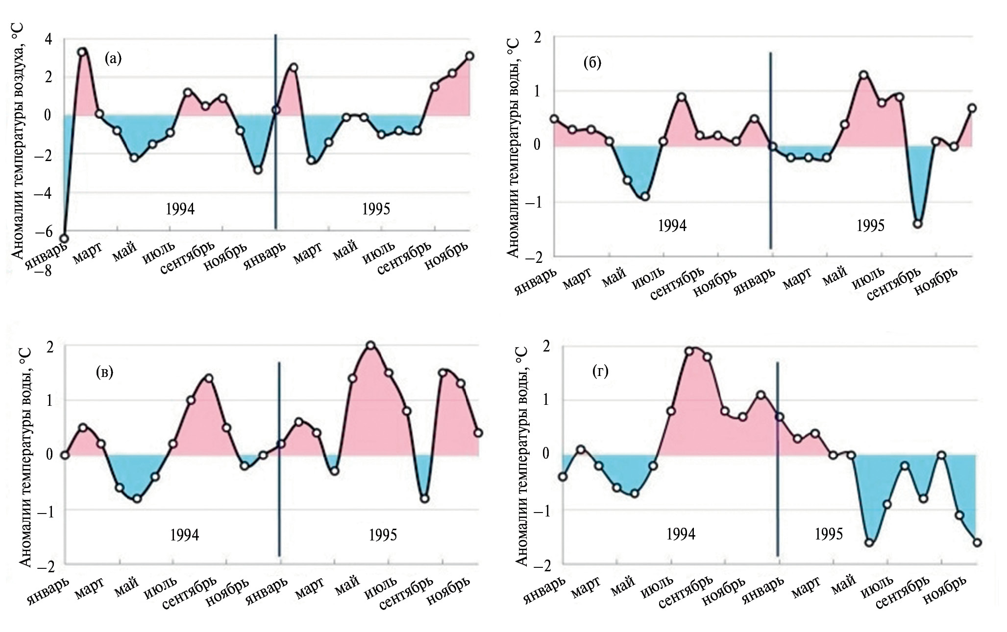 Рис. 7. Годовой ход аномалий температуры воздуха на ГМС Николаевск-на-Амуре (а) и аномалий температуры воды в Татарском проливе (б), на ГМС Советская Гавань (в) и в области Цусимского течения (г) в 1994 и 1995 гг.