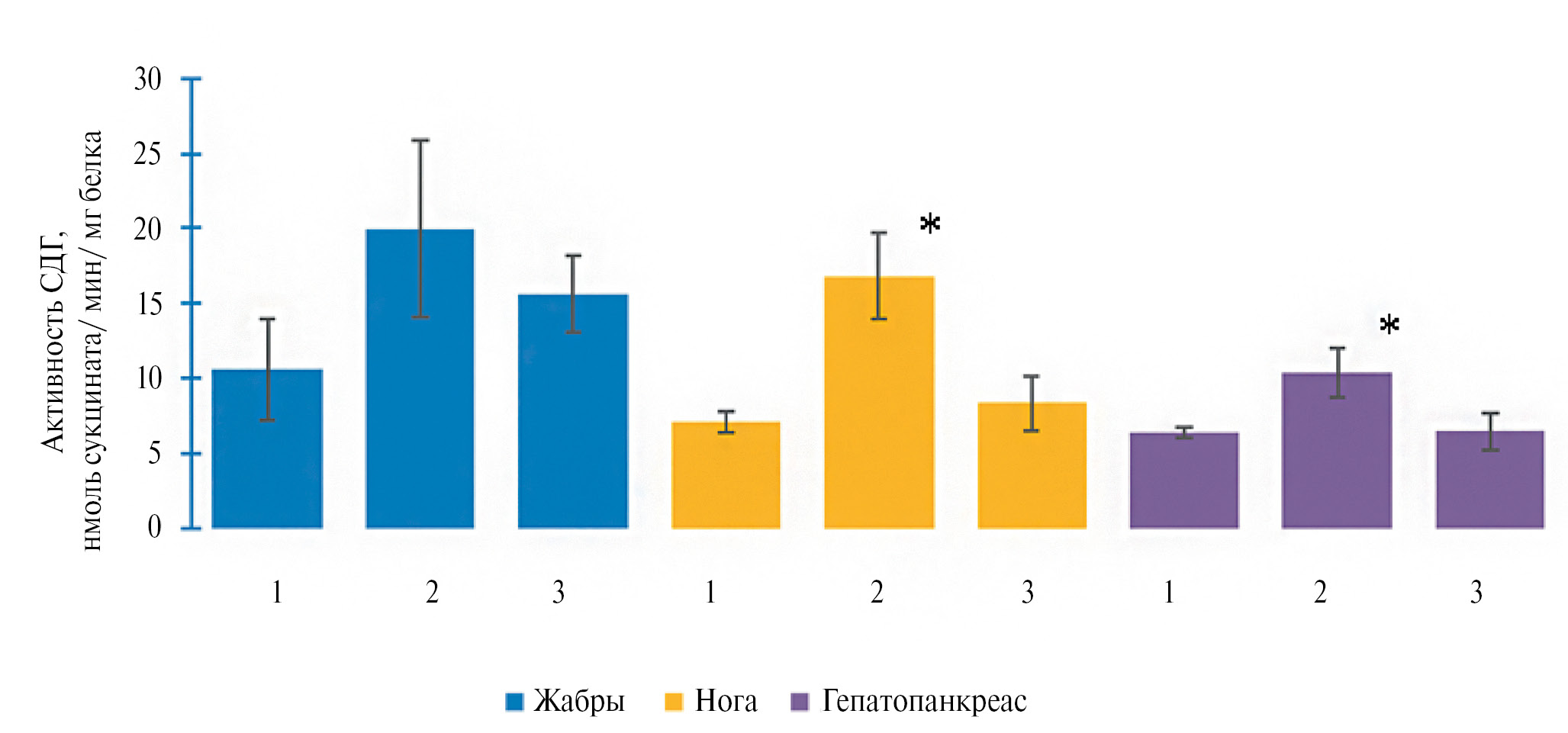 Рис. 1. Активность сукцинатдегидрогеназы (СДГ) в тканях анадары (1 – нормоксия; 2 – острая гипоксия; 3 – сероводородная нагрузка; *р< 0.05 относительно контроля; *р< 0.05 относительно контроля; n = 9).