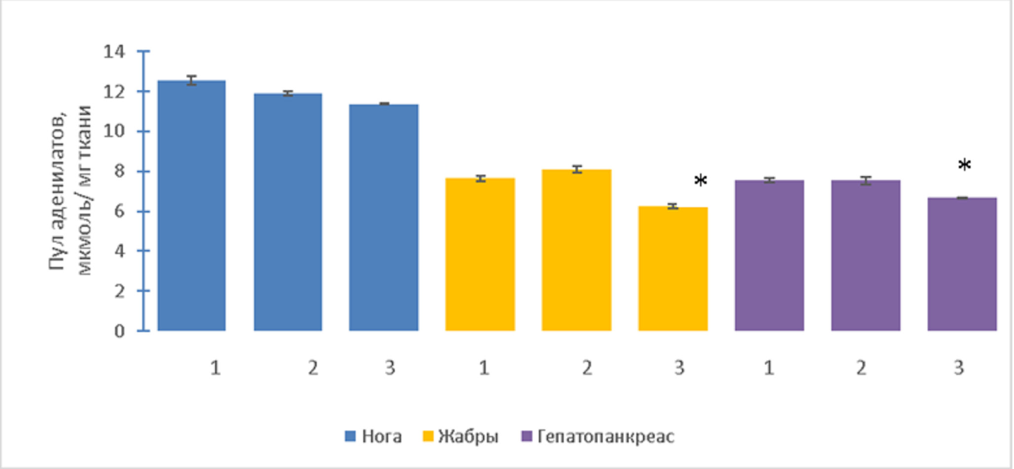 Рис. 2. Пул аденилатов в тканях анадары (1 – нормоксия; 2 – острая гипоксия; 3 – сероводородная нагрузка; n = 9).