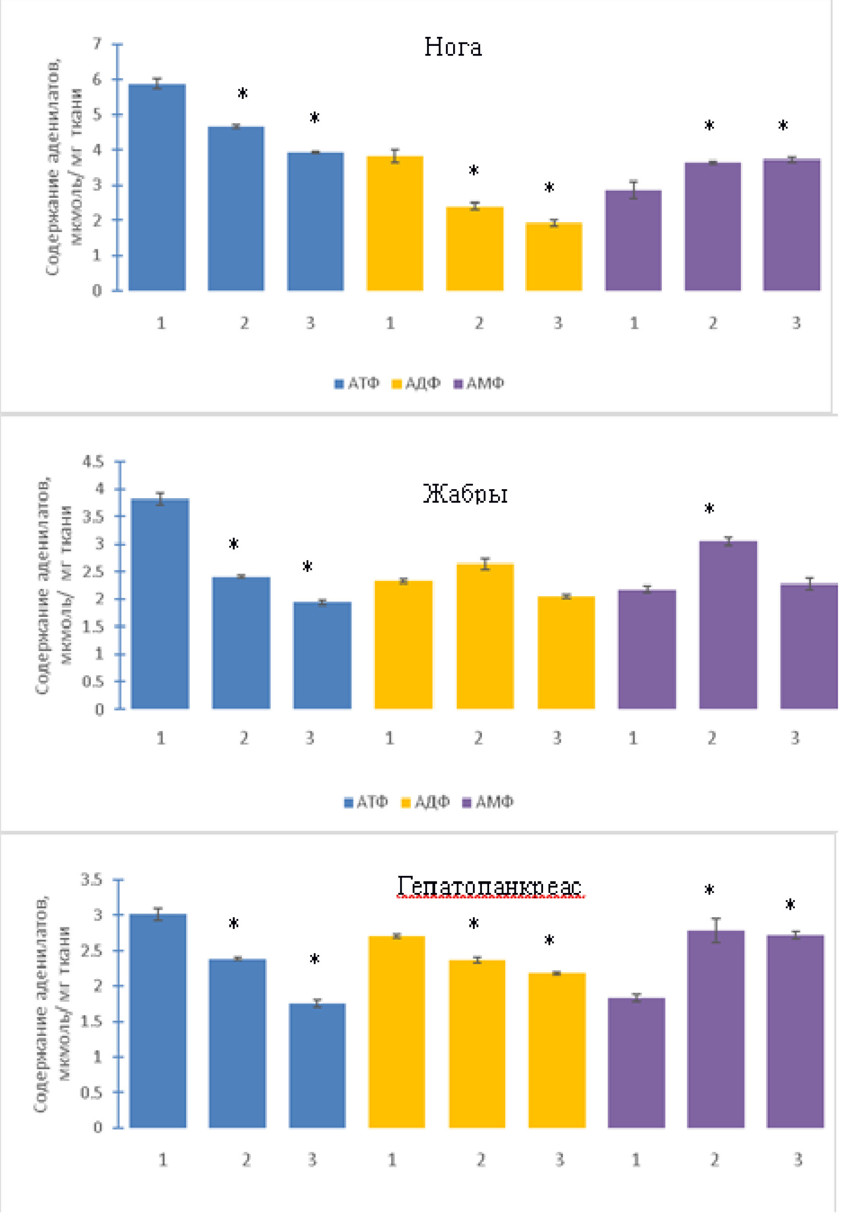 Рис. 3. Содержание отдельных фракций аденилатов (АТФ, АДФ, АМФ) в тканях анадары (1 – нормоксия; 2 – острая гипоксия; 3 – сероводородная нагрузка; *р< 0.05 относительно контроля; n = 9).