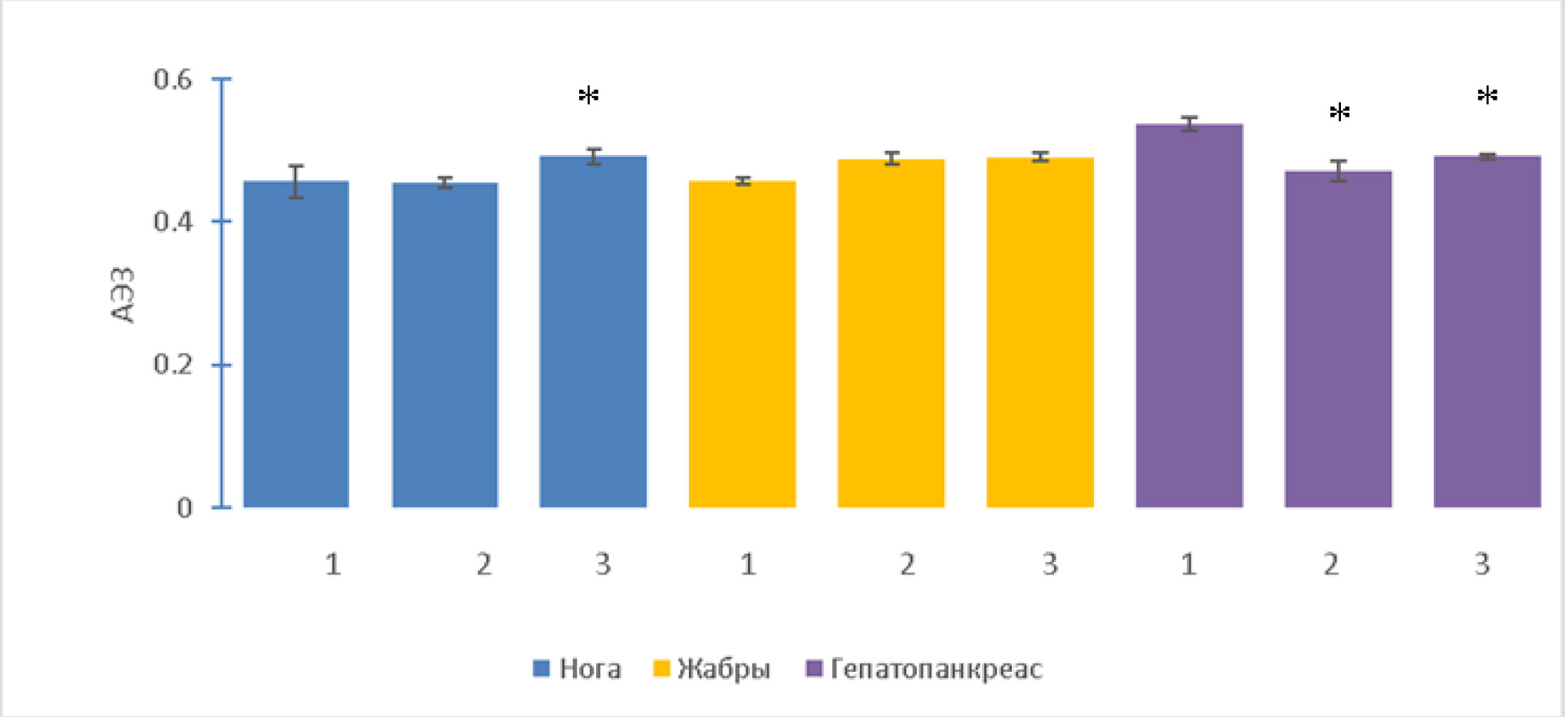 Рис. 4. Аденилатный энергетический заряд (АЭЗ) в тканях анадары (1 – нормоксия; 2 – острая гипоксия; 3 – сероводородная нагрузка; *р< 0.05 относительно контроля; n = 9).