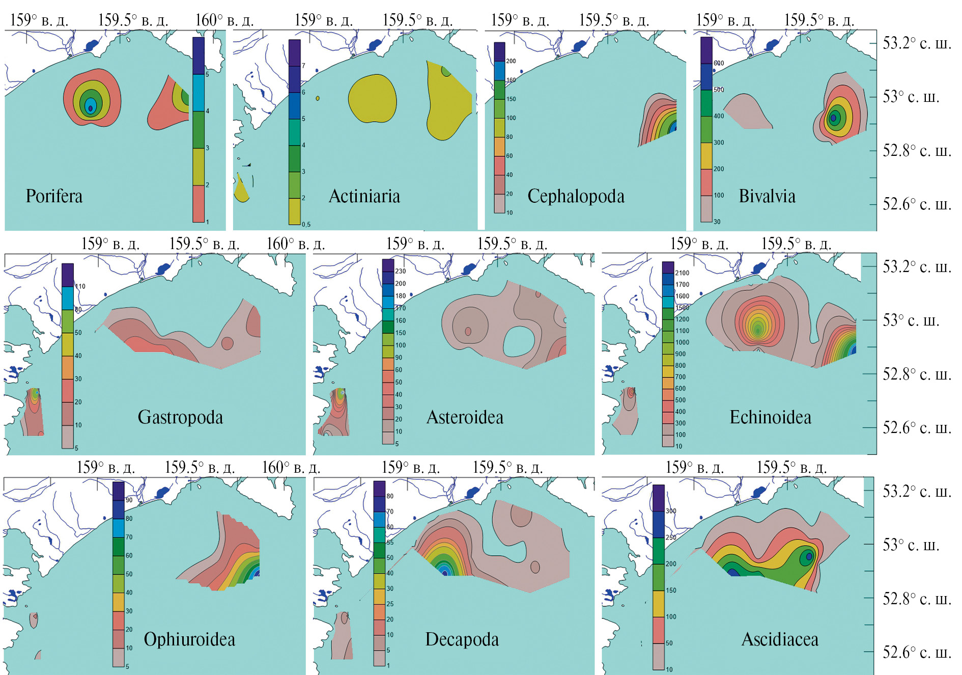 Средняя и максимальная плотность поселения (экз./км2) в 2022 г. сильно сократились (от полутора–двух раз до нескольких порядков) во всех группах, кроме Porifera и Decapoda на шельфе юго-восточного побережья Камчатки южнее мыса Поворотный (рис. 9). Там же отмечено увеличение в 1.5 раза максимальной плотности поселения Ascidiacea, а на шельфе Кроноцкого залива – увеличение в 2 раза максимальной плотности поселения Bivalvia (табл. 1, 2).