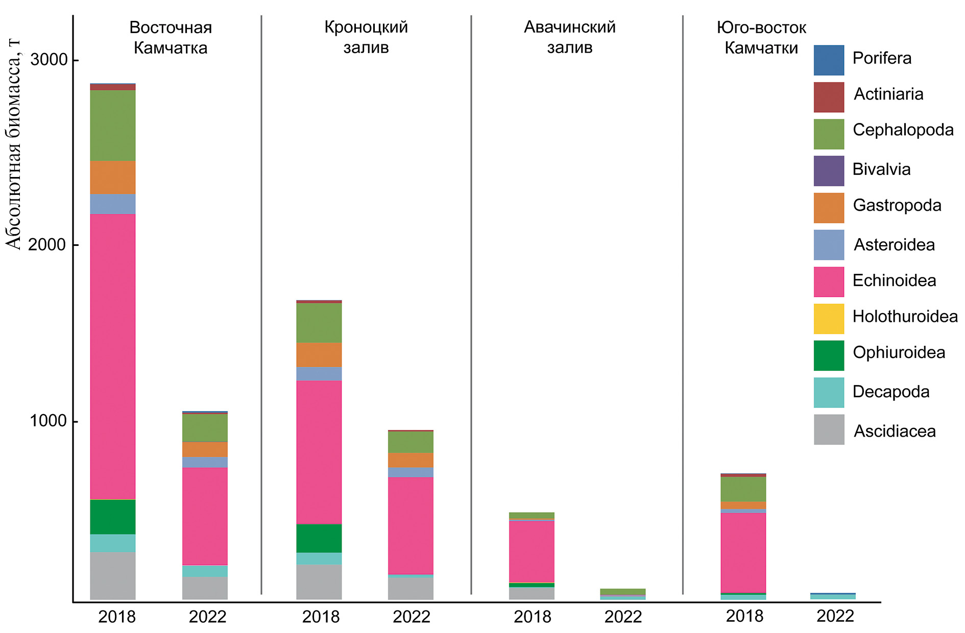 Абсолютная биомасса всех групп гидробионтов, выловленных на всех станциях от мыса Кроноцкий до южной оконечности Камчатки, в 2018 г. составляла 2875664.85 кг, а в 2022 г. – 1048455.57 кг (рис. 8), сократившись в 2.74 раза (на 63.5%). Меньше всего пострадал шельф Кроноцкого залива, где биомасса донных беспозвоночных в 2022 г. по сравнению с 2018 г. сократилась в 1.76 раза, убыль составила чуть более 43%. В Авачинском заливе биомасса в 2022 г. по сравнению с 2018 г. сократилась в 7.77 раза, погибло 87% донных беспозвоночных. Наиболее катастрофические потери наблюдались в самом южном районе исследований – на шельфе юго-восточного побережья Камчатки южнее мыса Поворотный, где биомасса донных беспозвоночных в зоне нижней сублиторали сократилась почти в 20 раз, погибло 95% учитываемого в приловах траловых съемок макрозообентоса.
