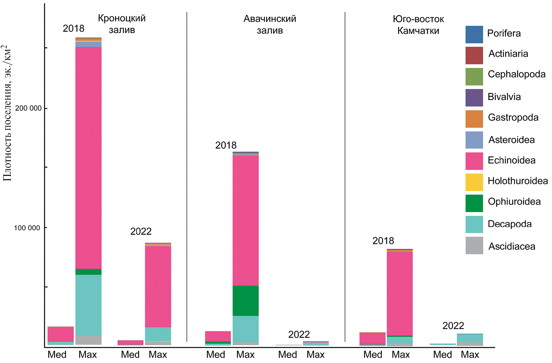 Рис. 9. Средняя (Med) и максимальная (Max) плотность поселения групп беспозвоночных, учтенных в приловах донных траловых съемок в 2018 и 2022 гг.