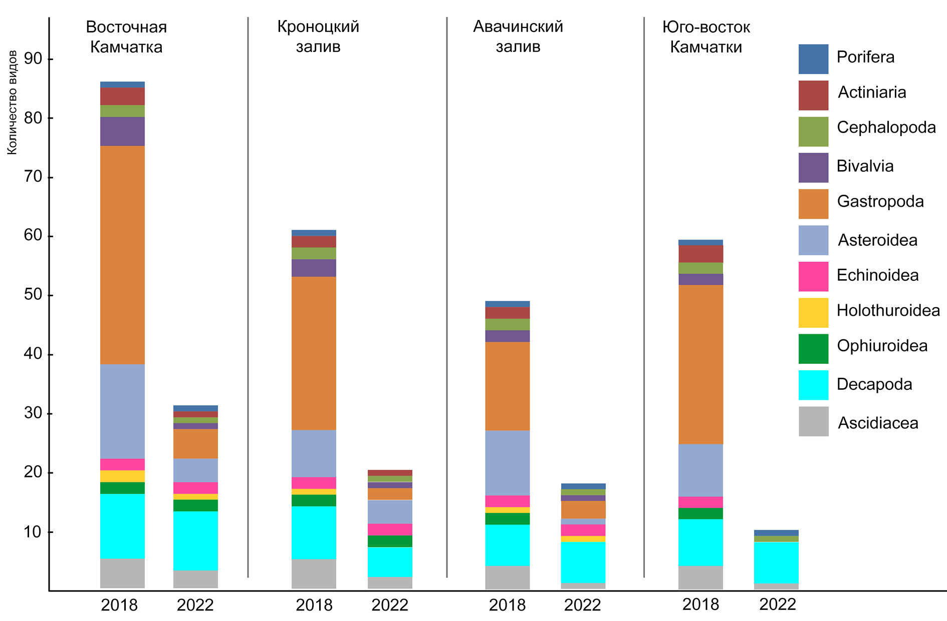 После заморных явлений, произошедших в результате ВЦВ осенью 2020 г., на шельфе Восточной Камчатки от мыса Кроноцкий до южной оконечности Камчатки произошло почти трехкратное обеднение донной фауны как по биомассе, так и по видовому разнообразию. Наименее пострадавшей группой можно считать ракообразных: несмотря на то, что регистрировали гибель ракообразных, их потери были меньше, чем в других группах беспозвоночных, а абсолютная биомасса Decapoda на шельфе Авачинского залива в 2022 г. увеличилась в 5 раз по сравнению с 2018 г. Наиболее пострадавшим является самый южный район от мыса Поворотный до мыса Лопатка, где произошло почти 20-кратное снижение абсолютной биомассы донных беспозвоночных в зоне нижней сублиторали, т.е. погибло 95% учитываемого в приловах траловых съемок зообентоса. Из десяти групп животных, учтенных в 2018 г., осталось менее половины. В 2022 г. в этом районе зарегистрировано тотальное отсутствие представителей шести таксонов высокого ранга: отряда Actiniaria и классов Bivalvia, Gastropoda, Asteroidea, Echinoidea и Ophiuroidea (всего типа Echinodermata); видовое разнообразие уменьшилось в 6 раз (исчезло более 83% видов). Наименее пострадавшим оказался самый северный участок шельфа в районе Кроноцкого залива: абсолютная биомасса сократилась в 1.76 раза (на 43%); из 11 групп донных беспозвоночных, зарегистрированных в 2018 г., в 2022 г. исчезли две − тип Porifera и класс Holothuroidea; видовое разнообразие сократилось в 3 раза (исчезло 67% видов). Шельф Авачинского залива пострадал значительно и занимает промежуточное положение при оценке ущерба между северным и южным районами: абсолютная биомасса сократилась в 7.77 раза (на 87%); из 11 групп донных беспозвоночных исчезли две − отряд Actiniaria и класс Ophiuroidea; видовое разнообразие сократилось в 2.7 раза (исчезло 63% видов).