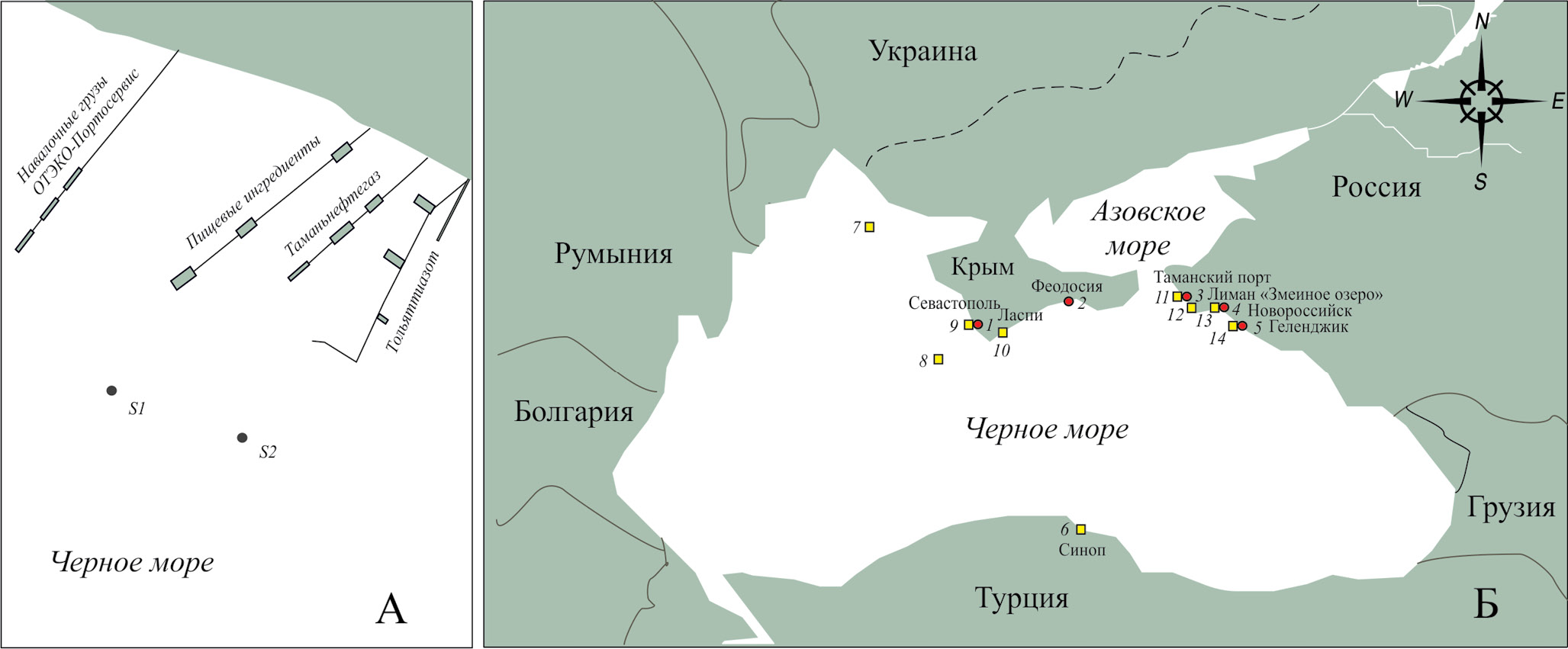 Рис. 1. Схема районов обнаружения тинтиннид в Черном море. А – станции (S1, S2) отбора проб раковинных инфузорий в прибрежной зоне Таманского порта в 2023 г. Б – районы обнаружения Rhizodomus tagatzi: 1 – Гаврилова (2010), 2 – Гаврилова, Довгаль (2019), 3 – наши данные; 4, 5 – Selifonova, Makarevich (2018) (круги); районы обнаружения Amphorellopsis acuta: 6–8, 10 – Гаврилова, Довгаль (2019); 9 – Gavrilova, Dovgal (2016); 11 – наши данные; 12 – Selifonova (2015); 13 – Селифонова (2011); 14 – Selifonova, Makarevich (2018) (квадраты).