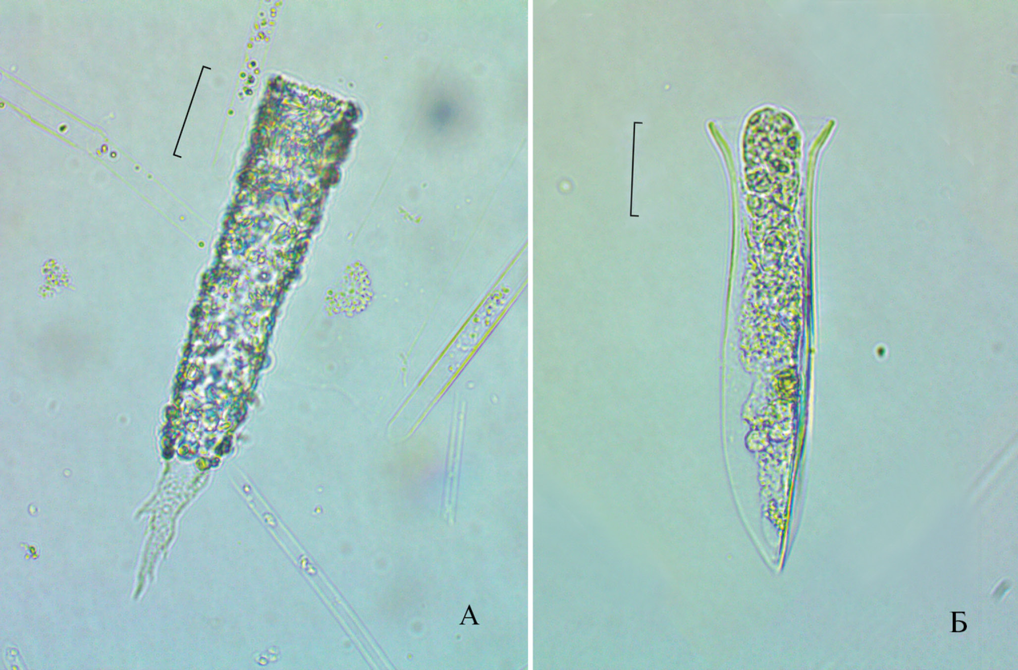 Рис. 2. Rhizodomus tagatzi (А) и Amphorellopsis acuta (Б) из прибрежной зоны Таманского порта. Увеличение ×400: А – 30 мкм, Б – 20 мкм.
