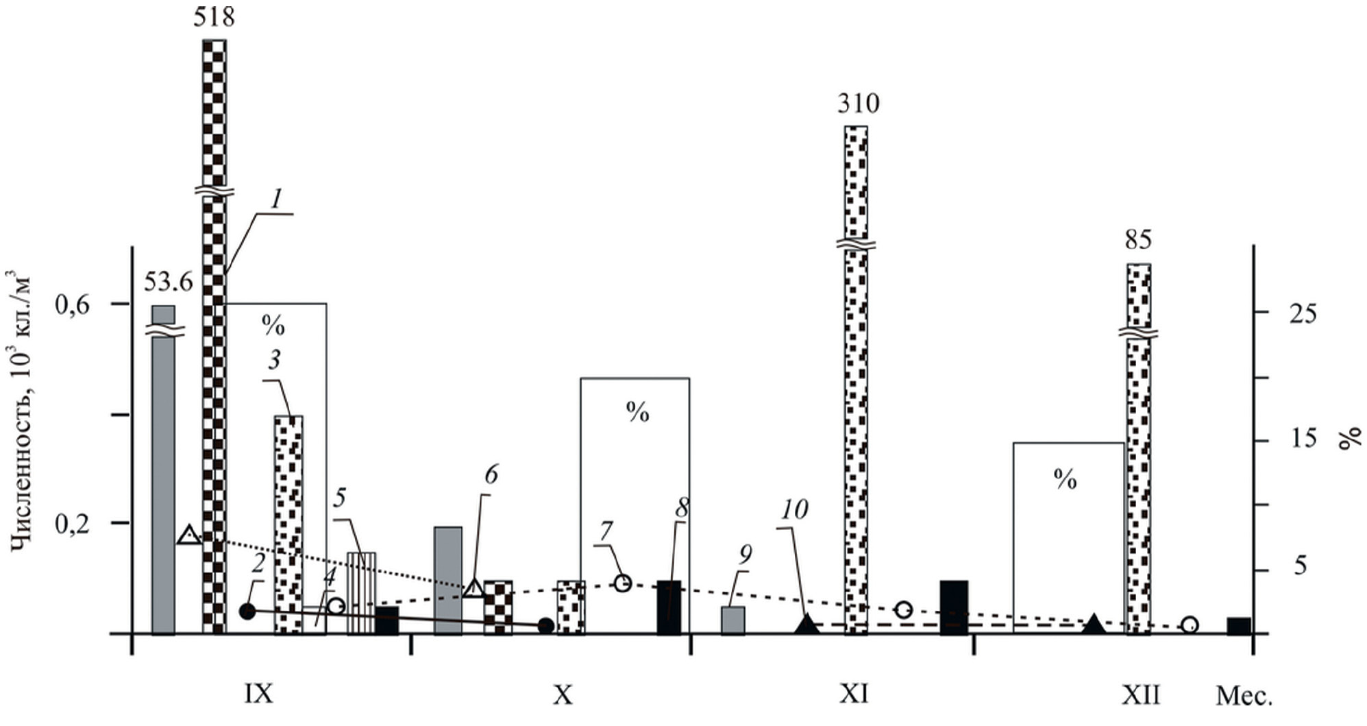 Рис. 3. Летне-осенняя динамика численности (103 кл./м3) раковиннных инфузорий в прибрежных водах Таманского порта: 1 – Rhizodomus tagatzi, 2 – Favella ehrenbergii, 3 – Amphorellopsis acuta, 4 – Eutintinnus tubulosus, 5 – Dartintinnus alderae, 6 – Tintinnopsis tocantinensis, 7 – E. apertus, 8 – Salpingella decurlata, 9 – Tintinnopsis tubulosa, 10 – Stenosemella ventricosa.