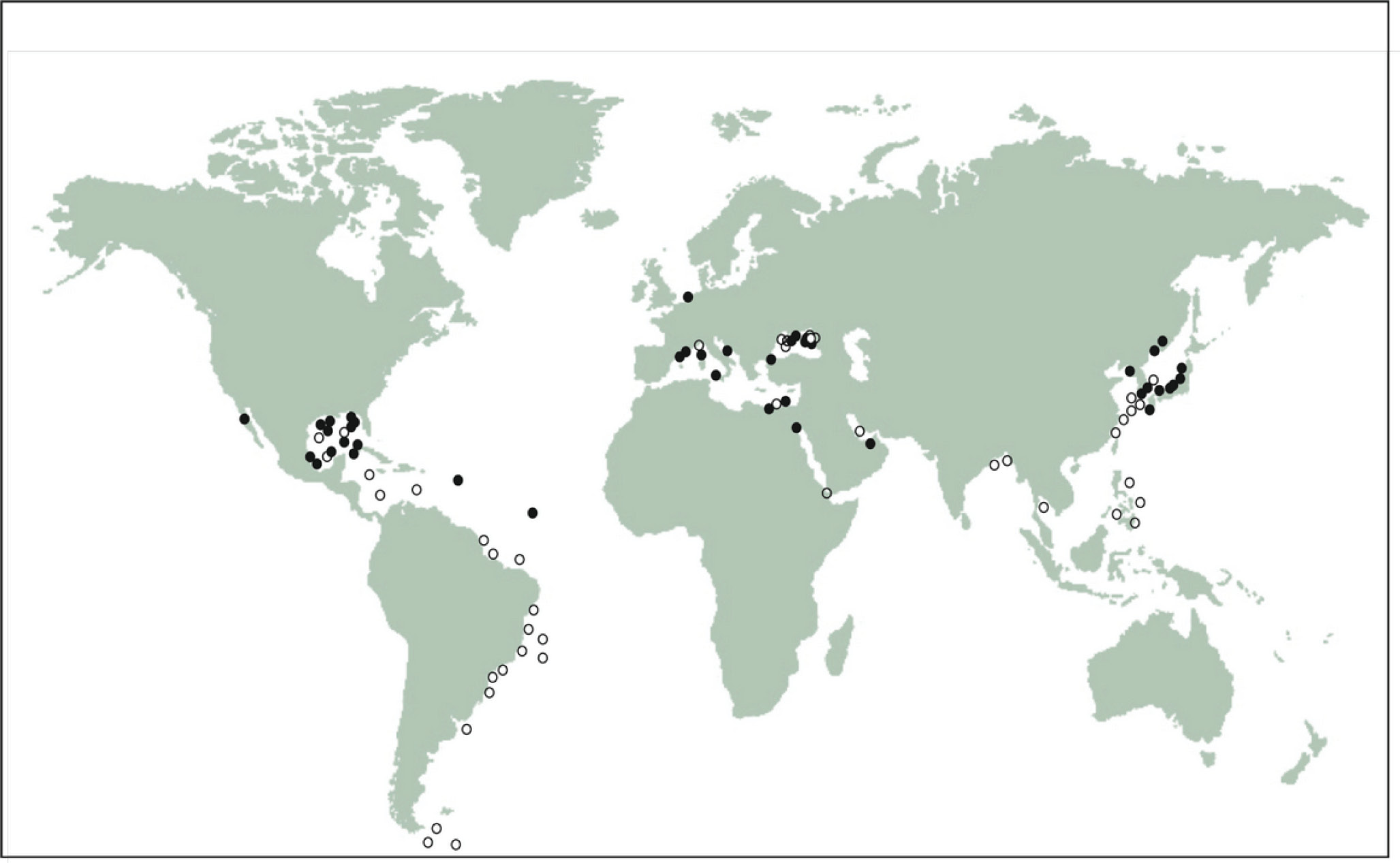 Рис. 4. Распространение Rhizodomus tagatzi в морях Мирового океана: (Гаврилова, Довгаль, 2019; наши данные; Saccà, Giuffrè, 2013; Selifonova, Makarevich, 2018) (черные круги); Amphorellopsis acuta: (наши данные; Селифонова, 2011; Гаврилова, Довгаль, 2019; Cariou et al., 1999; Fernandes, 2004; Coats, Clamp, 2009; Dorgham et al., 2009; Lee, Kim, 2010; Abou Zaid, Hellal, 2012; Dolan, Pierce, 2014; Santiago, Lagman, 2018; Tabarcea et al., 2023) (белые круги).