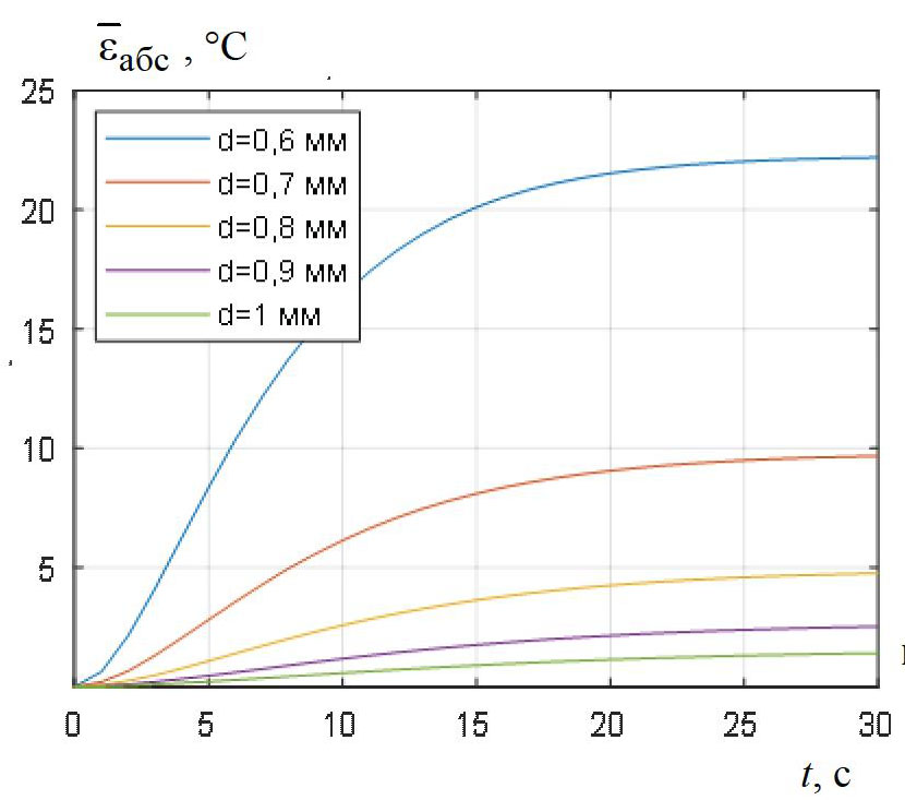 Рис. 3. Влияние диаметра спирали на изменение абсолютной погрешности расчета температуры спирали при ее нагреве