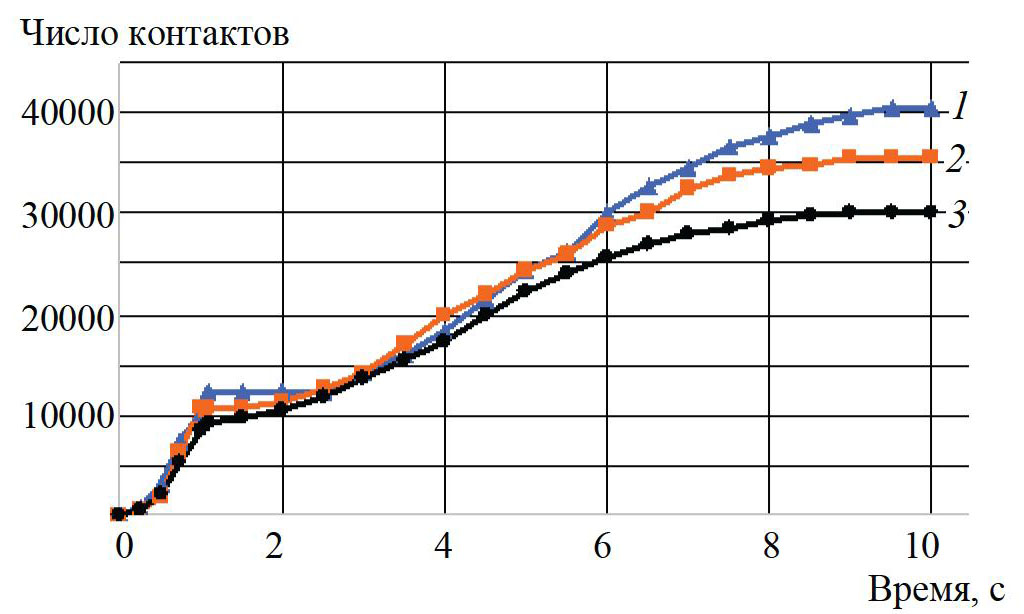 Рис. 2. Число контактов частиц во времени при соотношениях смешиваемых компонентов: 1 ‒ 1 : 1; 2 ‒ 1 : 3; 3 ‒ 1 : 5