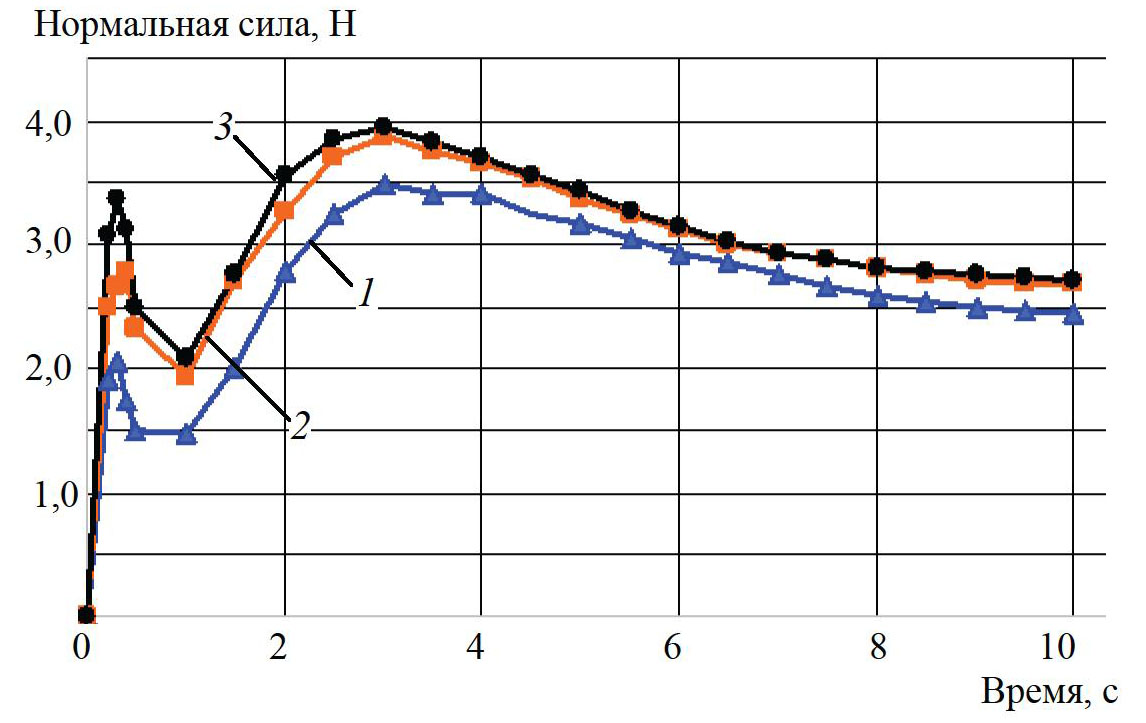 Рис. 3. Изменение нормальной силы, действующей на частицы, во времени при соотношениях смешиваемых компонентов: 1 ‒ 1 : 1; 2 ‒ 1 : 3; 3 ‒ 1 : 5