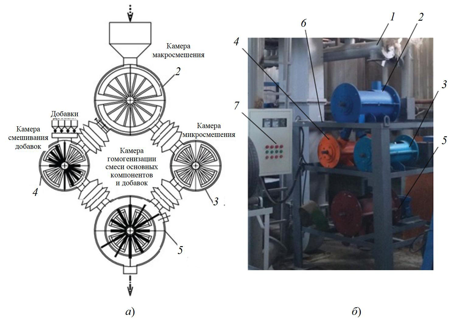 Рис. 3. Рециркуляционный смеситель комбинированного действия: а – схема компоновки камер агрегата; б – опытно-промышленный агрегат; 1 – транспортирующий шнек; 2 – камера макросмешивания; 3 – камера микросмешивания; 4 – камера смешивания добавок; 5 – камера окончательной гомогенизации; 6 – рама; 7 – пульт управления