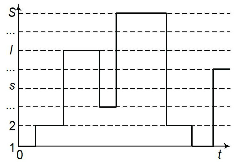 По итогам анализа возможной помеховой обстановки определены: перечень преднамеренных помех; возможные сигнально-помеховые ситуации, составляющие полную группу несовместных событий; априорные интенсивности смены из s-й в l-ю и – из l-й в s-ю сигнально-помеховых ситуаций; множество N сопутствующих признаков Pr воздействия помех на ИИУС. Вариант классификации сигнально-помеховых ситуаций при функционировании ИИУС показан в виде табл. 1, ожидаемые выходные сигналы измерителей и ИСП в соответствующих ситуациях – в табл. 2, в которых обозначены: ШШ, УШ, СШ – соответственно широкополосная, узкополосная, скользящая шумовые помехи; ХИ – хаотическая импульсная помеха; УД, УС, УН – соответственно уводящие по дальности, скорости, направлению помехи; aβ, D, V – соответственно измерители угла, дальности и скорости сближения с лоцируемым объектом; ИМ, СИ, ЧФ – соответственно индикатор мощности, счетчик импульсов, частотный фильтр, выступающие в роли индикаторов сопутствующих признаков помех. На рисунке 1 показан фрагмент графа возможных взаимных переходов между ситуациями, на рис. 2 – возможная реализация их смены.