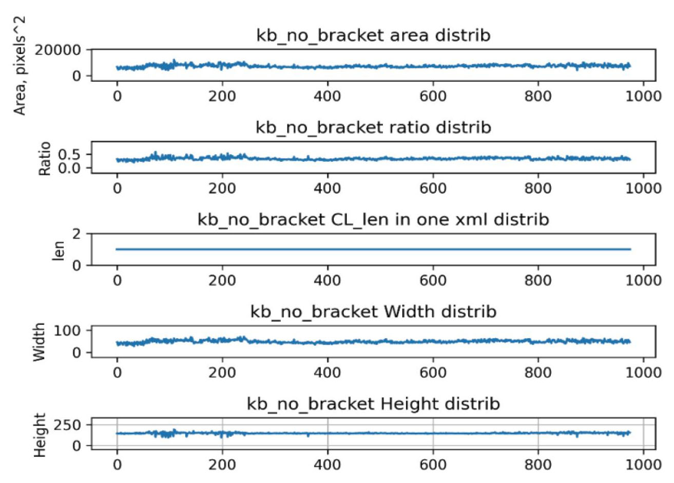 Для анализа корректности выделения прямоугольных областей и отнесения их к соответствующим классам построены графики зависимости параметров областей от размера выборки. Наиболее важными считаются следующие параметры размеченных рамок: площадь, отношение ширины к высоте, частота появления в одном кадре, ширина и высота. На рисунке 4 приведен пример таких графиков для класса kb_no _bracket. Графики демонстрируют зависимости перечисленных характеристик от номера объекта, а для частоты появления области – от номера картинки.