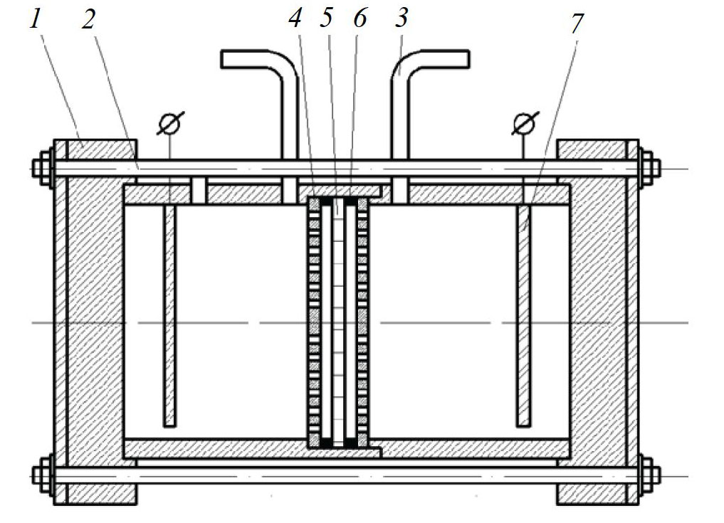 1 – корпус; 2 – шпильки; 3 – трубки контроля уровня раствора в камерах; 4 – перфорированные пластины; 5 – мембрана; 6 – прокладки уплотнения; 7 – электроды