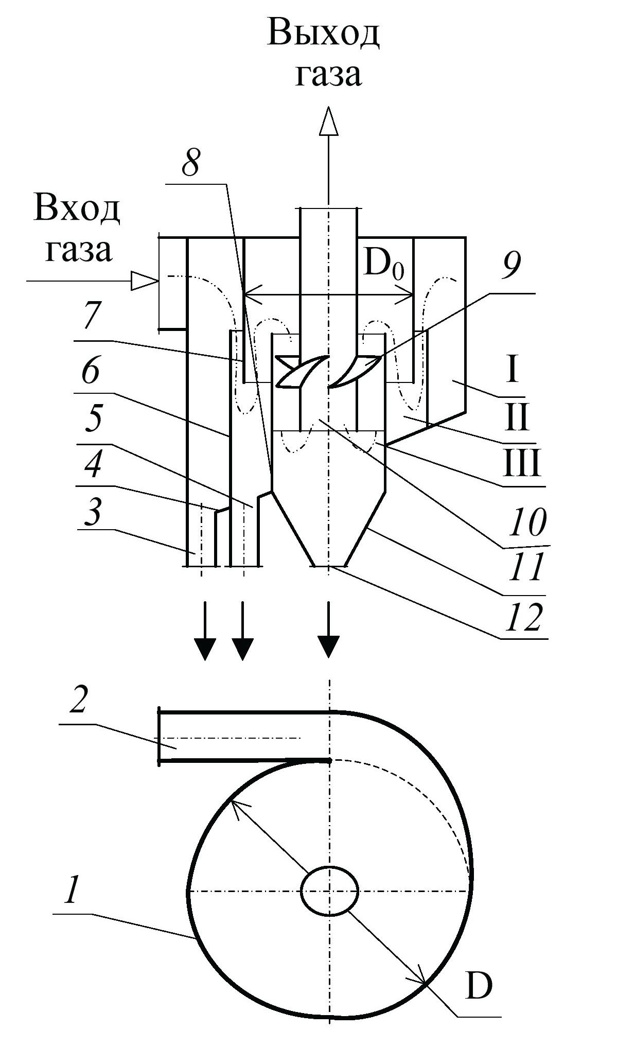 Схема аппарата представлена на рис. 1. В корпусе аппарата 1 размещены три ступени выделения твердых частиц из газового потока. Газ, содержащий взвешенные частицы, через спиральный входной патрубок 2 поступает на первую ступень очистки I, где крупные частицы пыли за счет центробежной силы смещаются к периферии и по наклонному днищу 4 опускаются к патрубку 3, а затем удаляются из аппарата. Поток газа со средней и мелкой фракцией поступает на вторую ступень очистки II, расположенную в пространстве между приемным цилиндром 6 и экраном 7. На второй ступени очистки за счет изменения направления движения потока происходит отделение частиц средней фракции, которые выводятся через патрубок 5. Поток газа с мелкой фракцией огибает наружную поверхность приемного цилиндра 8 и поступает на третью ступень очистки III, на которой за счет неподвижных лопастей 9 происходит закрутка пылегазового потока, повышается действие центробежной силы, в результате чего мелкодисперсные частицы отделяются от газового потока через выходной патрубок 10, а мелкодисперсные частицы пыли по спиралеобразной траектории вдоль стенок приемного цилиндра 8 опускаются на наклонное днище 11 и выводятся из аппарата через патрубок 12.