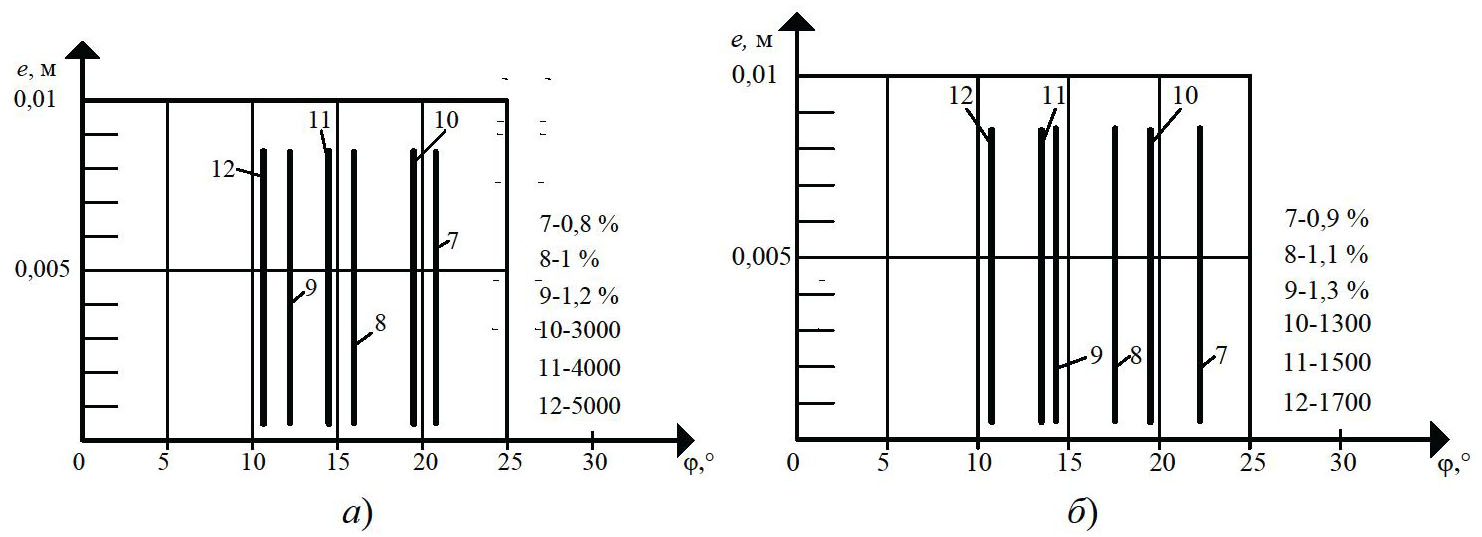 Критерий подвулканизации JB в большей степени зависит от зазора dц, чем от угла наклона нарезки j при изотермическом режиме экструзии (см. рис. 10, а). Причем, чем больше зазор dц (на 100 %) в области реальных значений угла наклона нарезки j, тем меньше критерий подвулканизации JB (на 66 %), что связано с уменьшением времени пребывания резиновой смеси в материальном цилиндре за счет большей производительности Q. Критерий подвулканизации JB практически не зависит от зазора dц, а в большей степени зависит от угла наклона нарезки j при неизотермическом режиме экструзии (см. рис. 10, б), что связано с малой величиной потока утечки в зазоре dц.