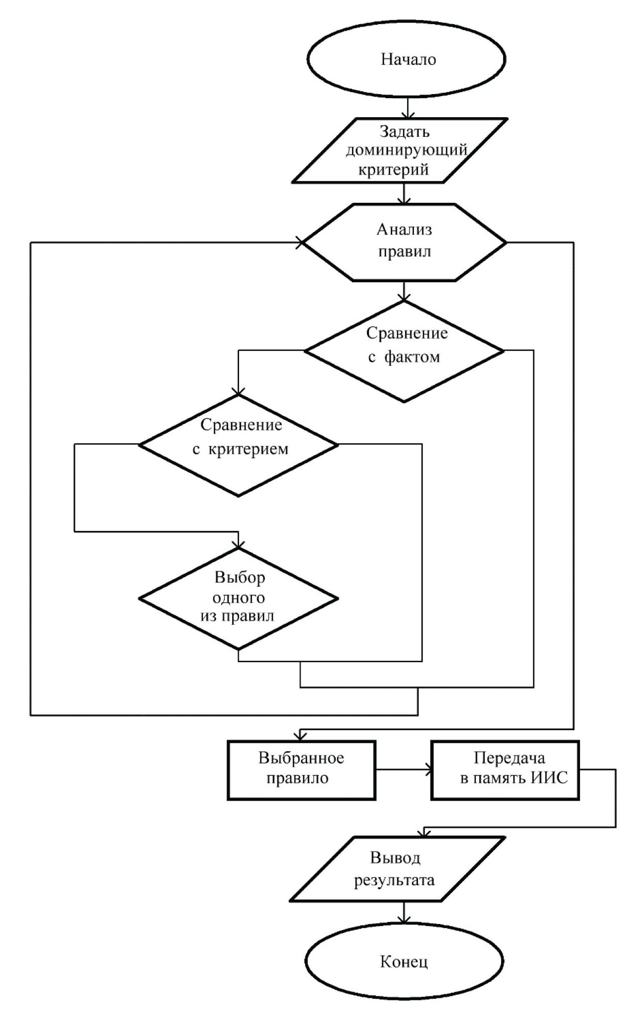 Интерпретатор программным способом реализует ряд циклов при выборе правил, включающих сравнение продукционных правил, срабатывание образцов правил, запись заключений в память ИИС (см. рис. 2). Каждый цикл включает вышеперечисленные операции, при этом срабатывает одно из правил. При срабатывании ряда правил за цикл интерпретатором программным способом выбирается одно правило, используемое в данном цикле. Определение используемых правил на основе интерпретатора с применением определенного критерия для выбора продукционного правила позволяет осуществить извлечение знаний для пользователей ИИС и представление их в требуемом виде.
