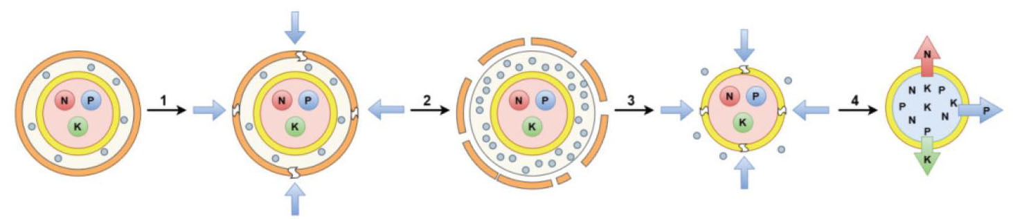 После внесения гранул удобрения в почву начинается диффузионное проникновение влаги в них из внешней среды через микропоры гидрофобного защитного покрытия. Микропоры покрытия могут образовываться как в результате жизнедеятельности микроорганизмов почвы и других внешних факторов, так и в процессе производства самой гранулы. После проникновения влаги внутрь гранулы происходит активация жизненного цикла микроорганизмов, их деление, расширение объема органического субстрата и его разрушение. Одновременно с распадом второго слоя начинается образование микропор в первом слое, обеспечивающем защиту неорганического ядра и пролонгированный эффект. Аналогично первой стадии влага через образованные микропоры диффундирует внутрь гранулы к ее ядру, медленно растворяет его, а образующийся раствор сложного NPK-удобрения медленно выходит наружу и питает растение.