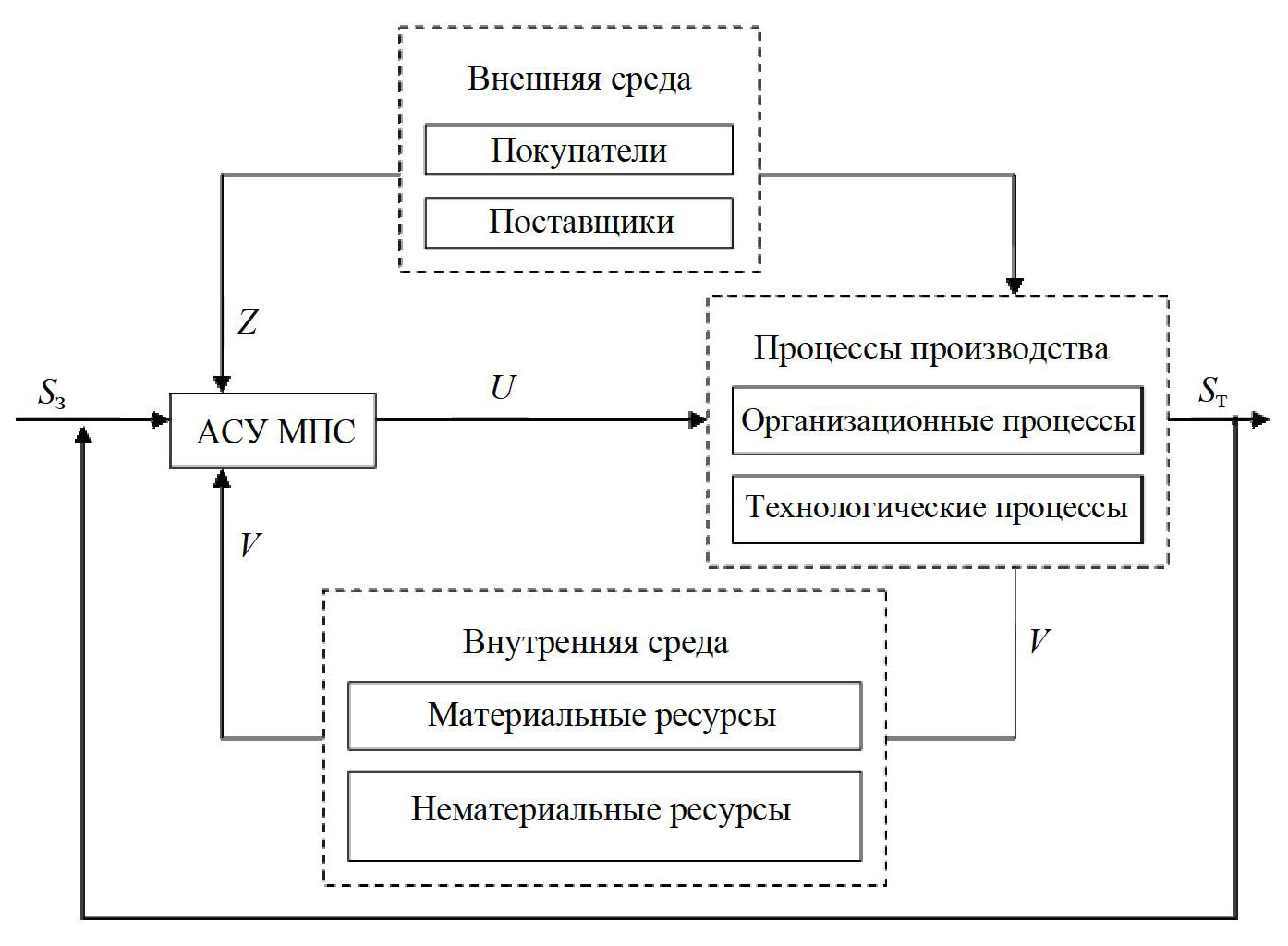 Для многосвязной производственной системы актуальной целью становится формирование единой автоматизированной системы управления (АСУ), которая обеспечит реализацию всех задач управления [11 – 16]. Представим модель МПС как совокупность процессов производственного цикла, учитывающих как материальные, так и информационные потоки, а также внутреннюю и внешнюю среды (рис. 1).