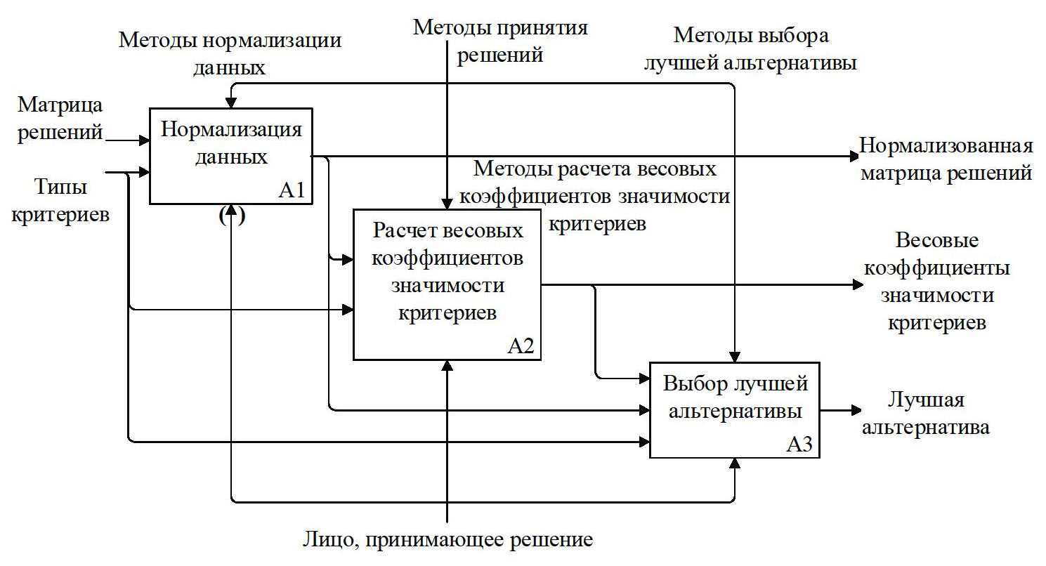 Входная информация для процесса А1 включает в себя матрицу решения и типы критериев, в то время как выходной информацией является нормализованная матрица решений. Для процесса А2 входная информация – нормализованная матрица решений и типы критериев, а выходная – весовые коэффициенты значимости критериев. Для процесса А3 входная информация содержит нормализованную матрицу решений, типы критериев и весовые коэффициенты значимости критериев, а в качестве выходной информации выступает лучшая альтернатива.