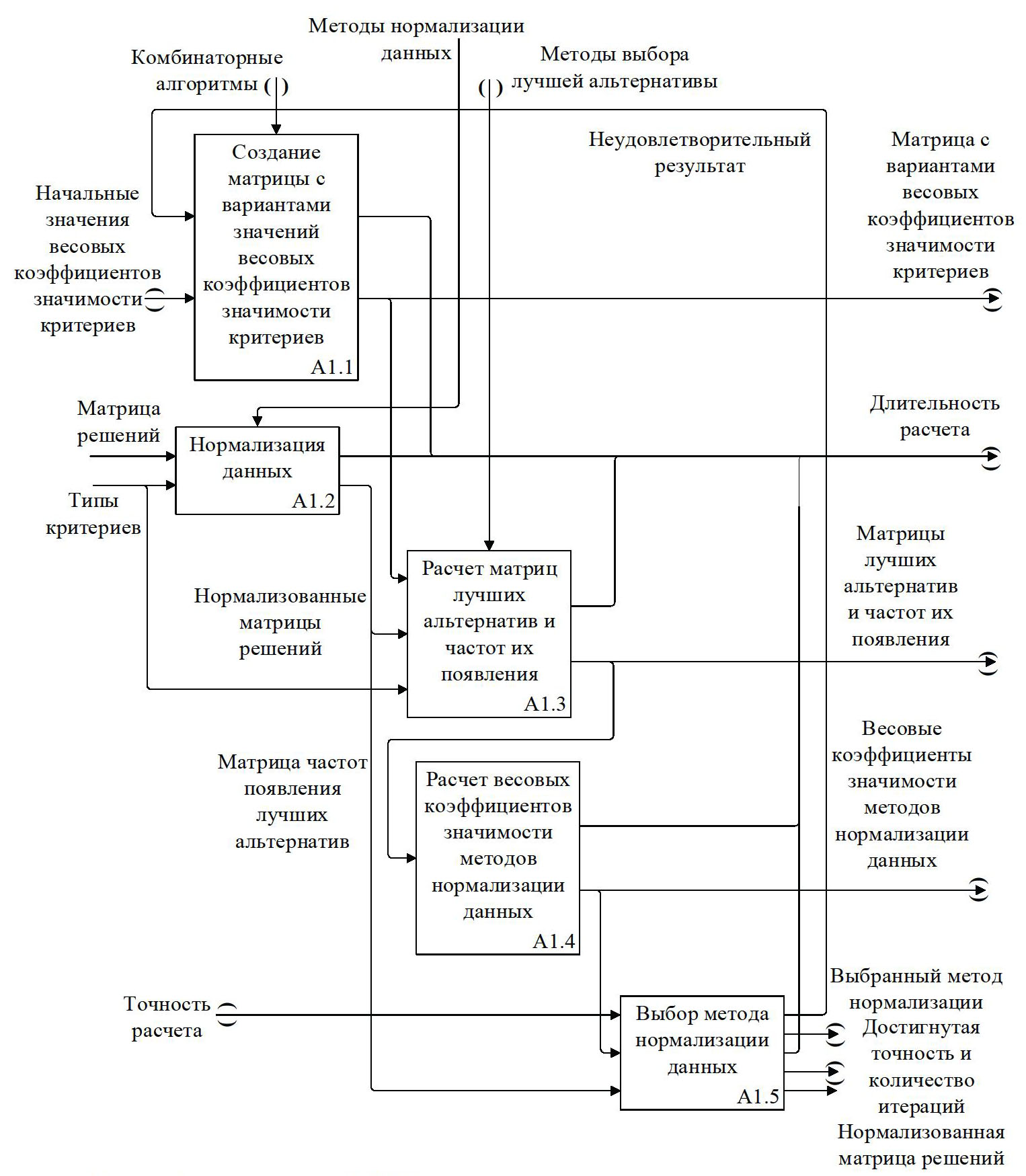 Весовые коэффициенты значимости методов нормализации данных, нормализованные матрицы решений и точность расчета используются подпроцессом А1.5 в качестве входной информации для выбора метода нормализации данных. Его выходная информация содержит выбранный метод нормализации, достигнутую точность и количество итераций, а также нормализованную матрицу решений. В случае недостижения точности расчета информация о неудовлетворительном результате используются в качестве входной информации у подпроцесса А1.1 для создания новой матрицы с вариантами весовых коэффициентов значимости критериев, тем самым организуя обратную связь по входу.