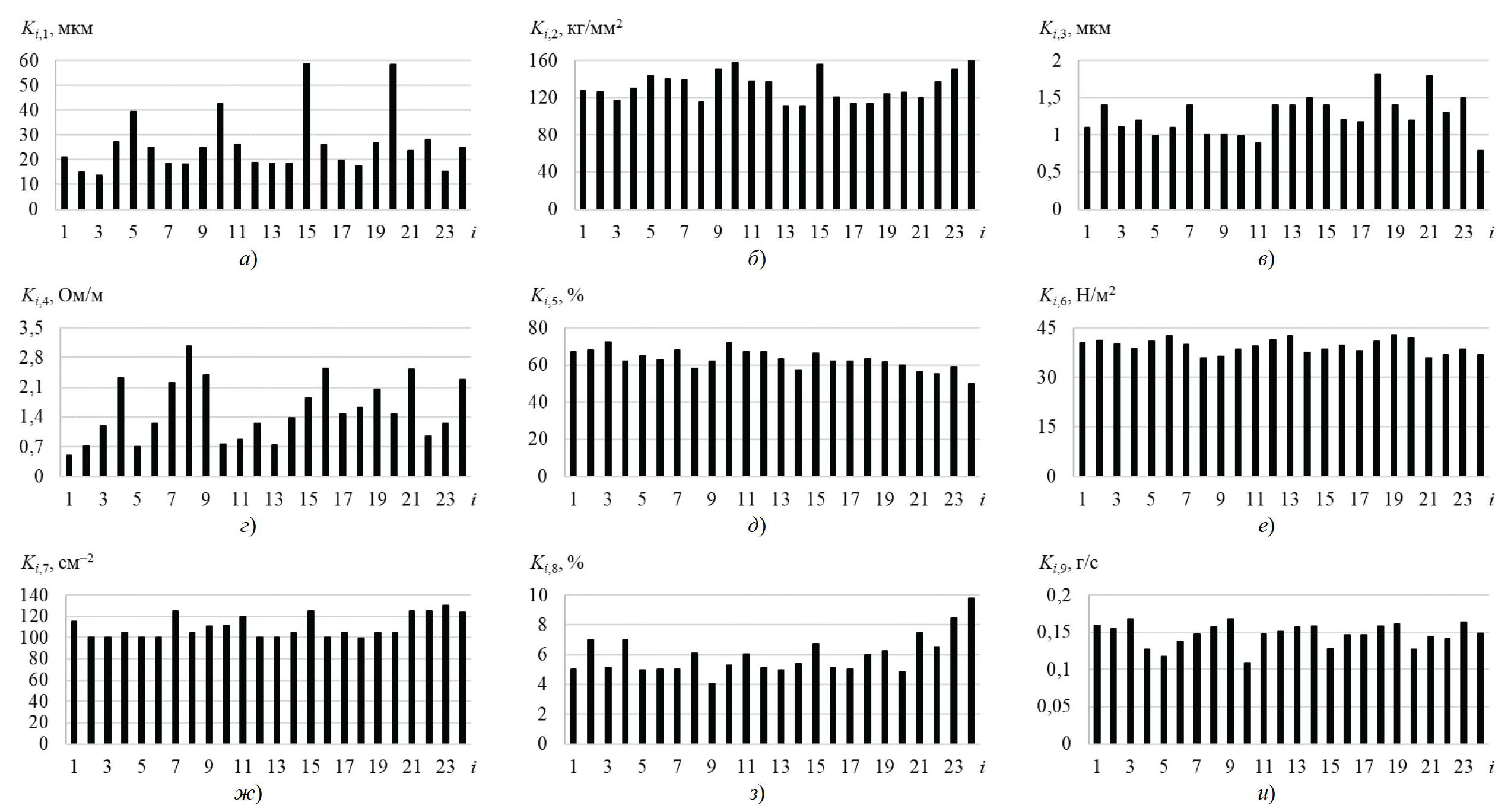 Рис. 3. Значения альтернатив A1 – А24 по критериям K1 – K9 (соответственно а – и)