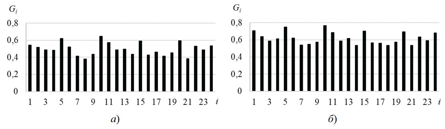 Рис. 6. Взвешенный аддитивный критерий качества, рассчитанный с использованием нормализованных матриц решений по методам M2 (а) и M6 (б)