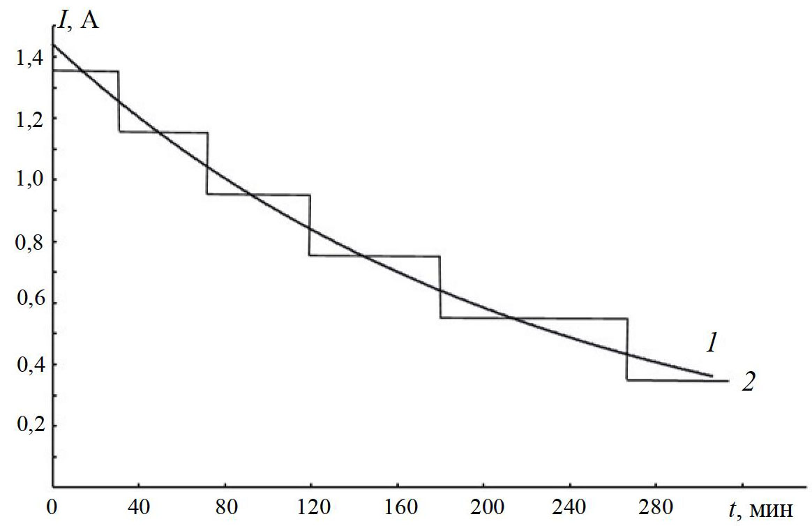 Рис. 2. Изменение тока при электролизе: 1 – расчетная кривая; 2 – ступенчатое изменение тока: С0 = 60 г/дм3, S/V = 4,8 дм–1