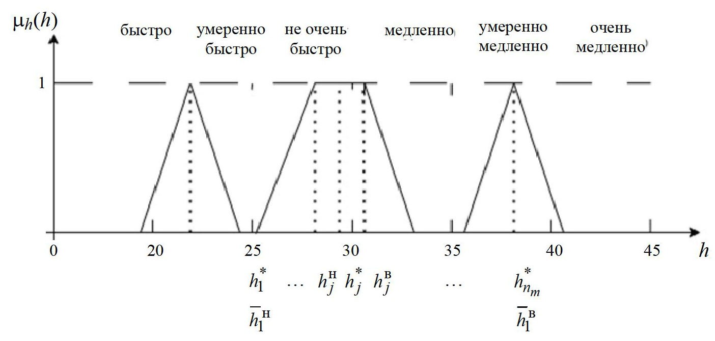 Как отмечено выше, время стекания электролита из гальванического барабана при вывешивании его над технологической позицией зависит от плотности засыпаемых деталей, процента заполнения объема барабана, а также размера перфорации. В связи со сложностью получения строгой математической зависимости времени от этих параметров использовали качественную оценку. В работе она представлена термами: «быстро», «умеренно быстро», «не очень быстро», «медленно», «умеренно медленно», «очень медленно» и др. Для количественной оценки времени (лингвистической переменной) и сравнения ее с другими вариантами формируемого множества решения задачи (1) – (5) необходимо определить четкие значения ее термов, которые бы позволили осуществить переход от нечетких значений к числовым. Значение времени h, описанное Л-функцией принадлежности, в качестве центра максимума будет принимать величину , а при описании П-функцией – (рис. 3). Для нахождения взвешенного значения h использована формула