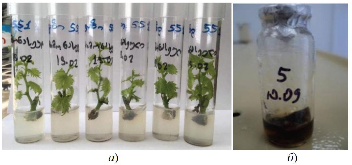 Наличие признаков зараженностей четко выражается изменением цветовых характеристик как экспланта, так и самой питательной среды (рис. 2, б), что необходимо обнаружить как можно быстрее для предотвращения потери образца.