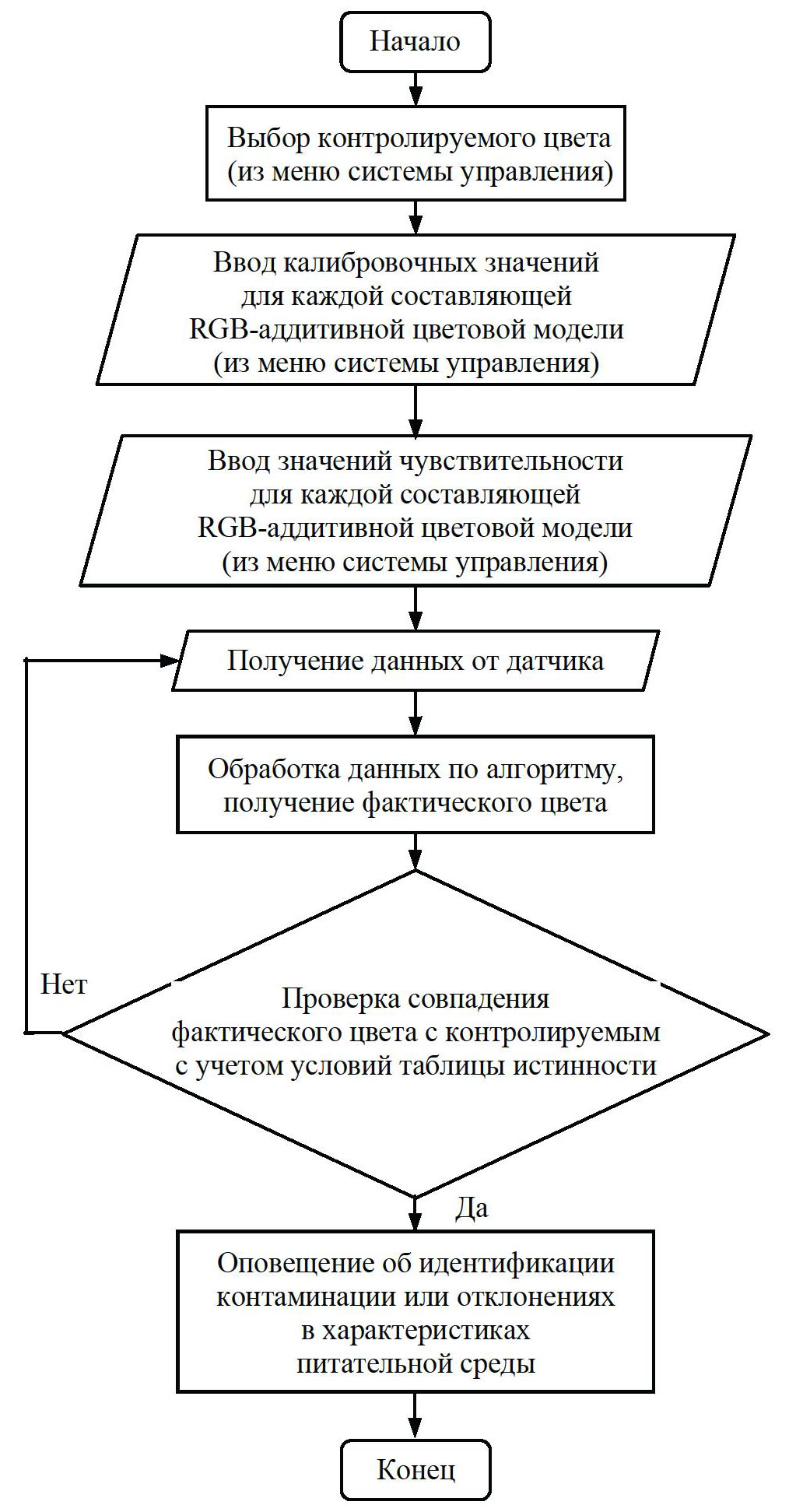 Рис. 4. Алгоритм автоматизированного контроля контаминации в питательной среде / растительном объекте, характеристик питательной среды (отклонений от регламентированных показателей)